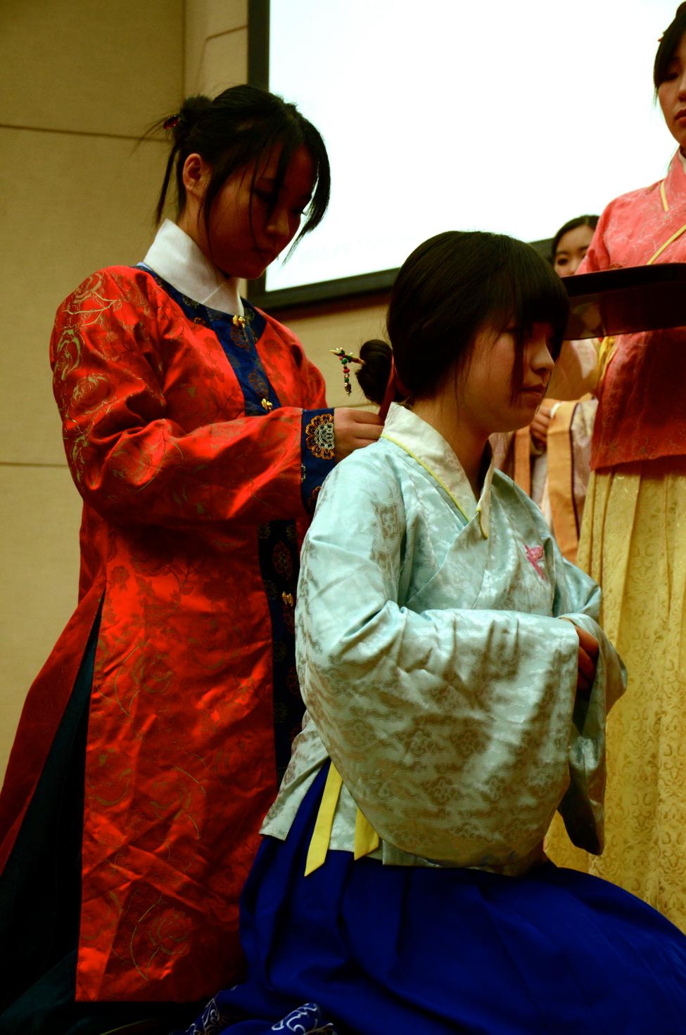 随着古曲悠扬响起,扮演笄者母亲和侍女的演员从舞台右侧走向中间,同时扮演正宾的演员从舞台左侧上台。升礼之后,笄者从屏风后面缓缓步出,首先向观礼宾客行揖礼,然后跪坐席上,由侍女梳头。正宾盥手,为笄者加笄礼。正宾先把笄者的长发挽成一个髻,然后从左侧侍女手中的托盘上拿过玉笄,从发髻的右侧插入,固定在脑后。
