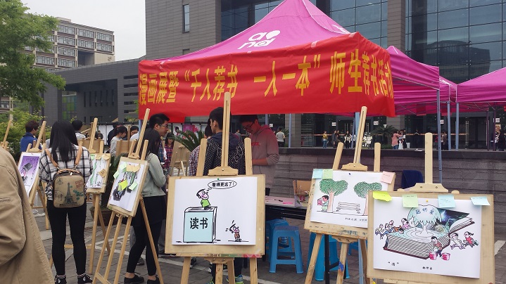 【文/记者团 王钰】2015年4月24日,上午11点左右,由小黄书 主办的2015年读书漫画展暨“千人荐书,一人一本”师生荐书活动在食堂门口火热开展。活动吸引了近千名师生前来参观漫画展,380多名师生为活动留下了他们的推荐书目。