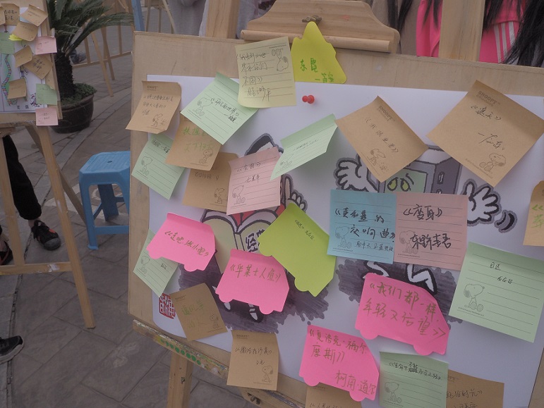 每位同学推荐一本书,就可以领取一张精美明信片。新颖的活动形式吸引了不少同学,现场活动气氛十分高涨,许多老师、同学路过活动场地都会驻足停留,写下推荐书目。推荐内容从经典名著到网络文学,言情、推理等十分丰富。数十张画板上贴满了师生们推荐的书目,明信片也一扫而空,不算宽裕的活动场地上人满为患。