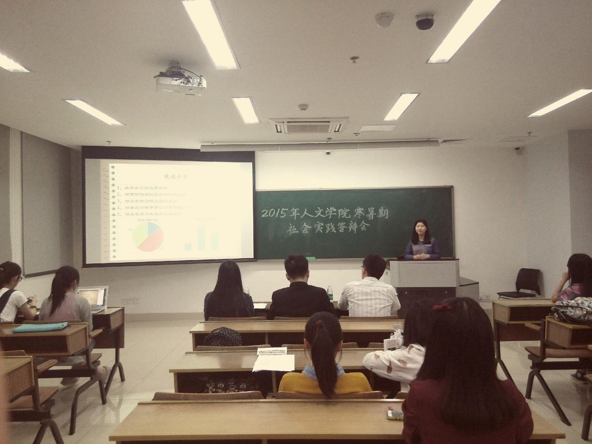 首先开始的是2015年寒假社会实践成果答辩会。申报寒假社会实践活动的共有5支队伍,活动内容包括方言调查研究、留守儿童“暖年”晚会、阳光家教调查、赴中学交流辅导等。五位负责人按顺序上台展示自己队伍的实践过程和成果。评委老师按照演示稿内容和演讲过程打分,评出了一、二、三等奖。