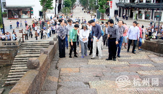 国际古迹遗址理事会印度籍专家莉玛· 胡贾考察广济桥(原载“杭州网”)。