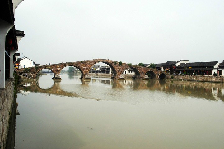天气晴朗的时光,行人头顶着灰黄的楼板,从略显阴暗的店铺和米床之间走过,一直往西直到街的尽头,忽见一道阳光,斜照在一座大桥桥堍的素面石栏板和栏板两端的卷云纹抱鼓石上,泛着幽幽的青光。顺着大桥粗糙而平缓的石阶,一步步登上桥顶,往南眺望,便见鳞次栉比的瓦房屋顶,以及耸立其间的两叠或三叠的马头墙,那高低错落的粉墙黛瓦,笔直地向前伸展,一眼望不到头。
