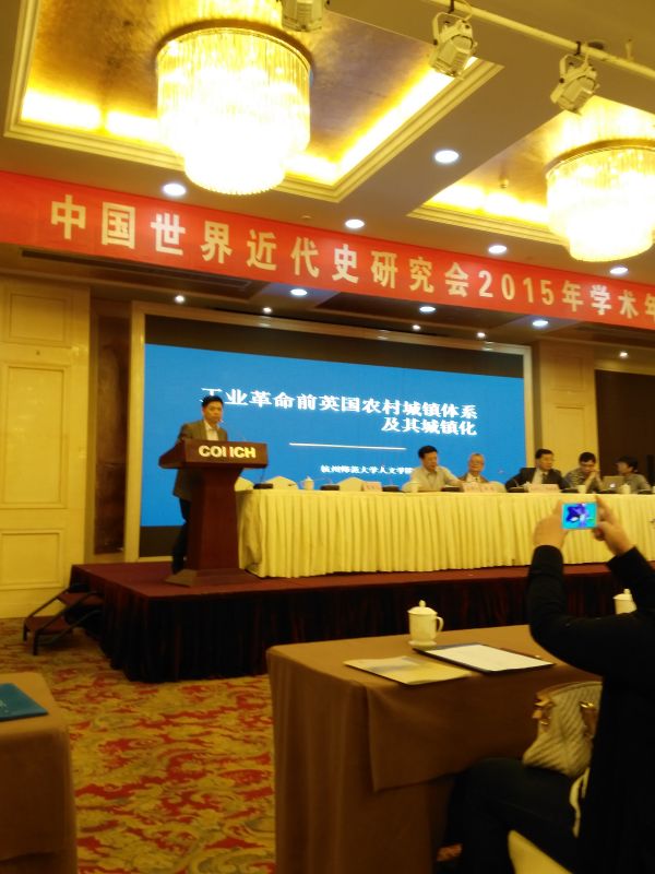 2015年10月24日至26日,中国世界近代史研究会2015年学术年会在安徽芜湖安徽师范大学召开。此次年会有中国社会科学院、香港大学、北京大学、南京大学、南开大学、《历史研究》编辑部、商务印书馆等90多所大学、科研、出版机构的约200位代表参加。小黄书 张卫良教授出席此次年会,并做了“工业革命前英国农村城镇体系及其城镇化”的大会主题报告,在报告中指出英国的城市化也经历了一个漫长而曲折的过程,并不是工业革命来临以后直线发展的。英国农村城镇体系在中世纪时代早期开始萌芽,至中世纪晚期,农村城镇的基本格局已经形成,在近代早期,市场城镇在地方社会中的作用越来越大,随着居住人口增加、专业化程度提高和社会服务能力的提升使农村小城镇成为宜居宜业的社会生活中心。此报告获得了大会代表的积极回应与反响。