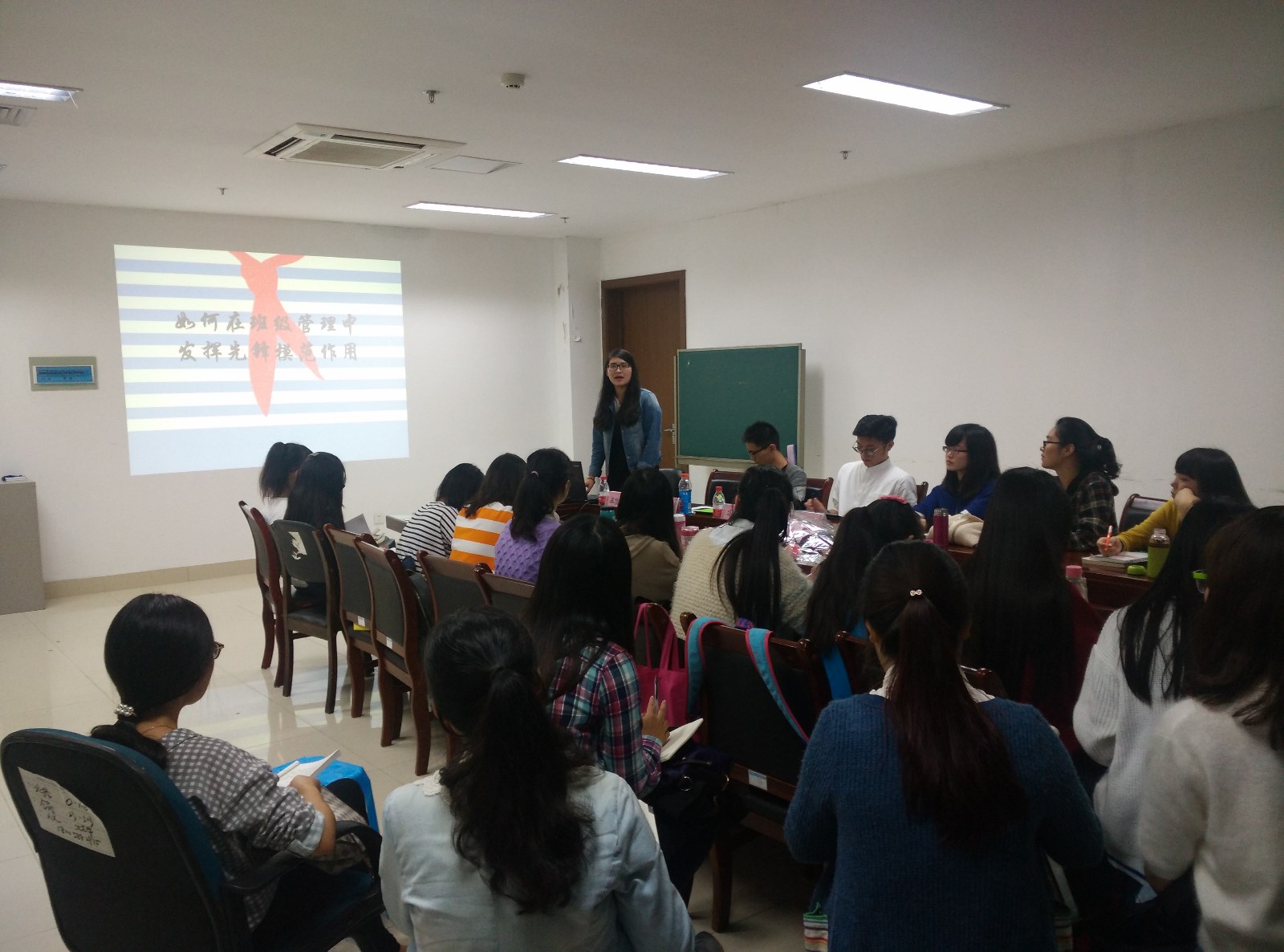 首先,傅培恩老师做了简短的开场白,介绍了朋辈讲堂的益处与意义。接下来,学生代表依次发言,首先是本科生第一学生党支部牟佳妮学姐就“如何在班级建设中发挥先锋模范作用”进行演讲。她以亲身经历作辅,认为要发挥先锋模范作用必须“以身作则”,严格要求自己,成为一个心中有爱、有责、有诚、有敢的人。在谈到与同学交流的问题时,她还向大家分享了有关交际的点子,譬如:与人为善,多多交流,学会倾听别人的意见等。