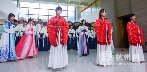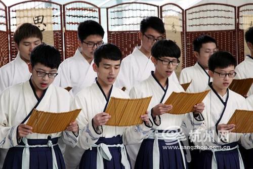 在中宣部、国家新闻出版广电总局等部门倡导和开展全民阅读十周年之际,在“世界读书日”来临前夕,4月20日下午,杭师大仓前校区学生活动中心人潮涌动,30位阅读爱好者身着古服、手持竹简,正在吟诵《子衿》、《蒹葭》、《橘颂》、《将进酒》等经典篇目,串起先秦到汉唐的悠悠文脉。