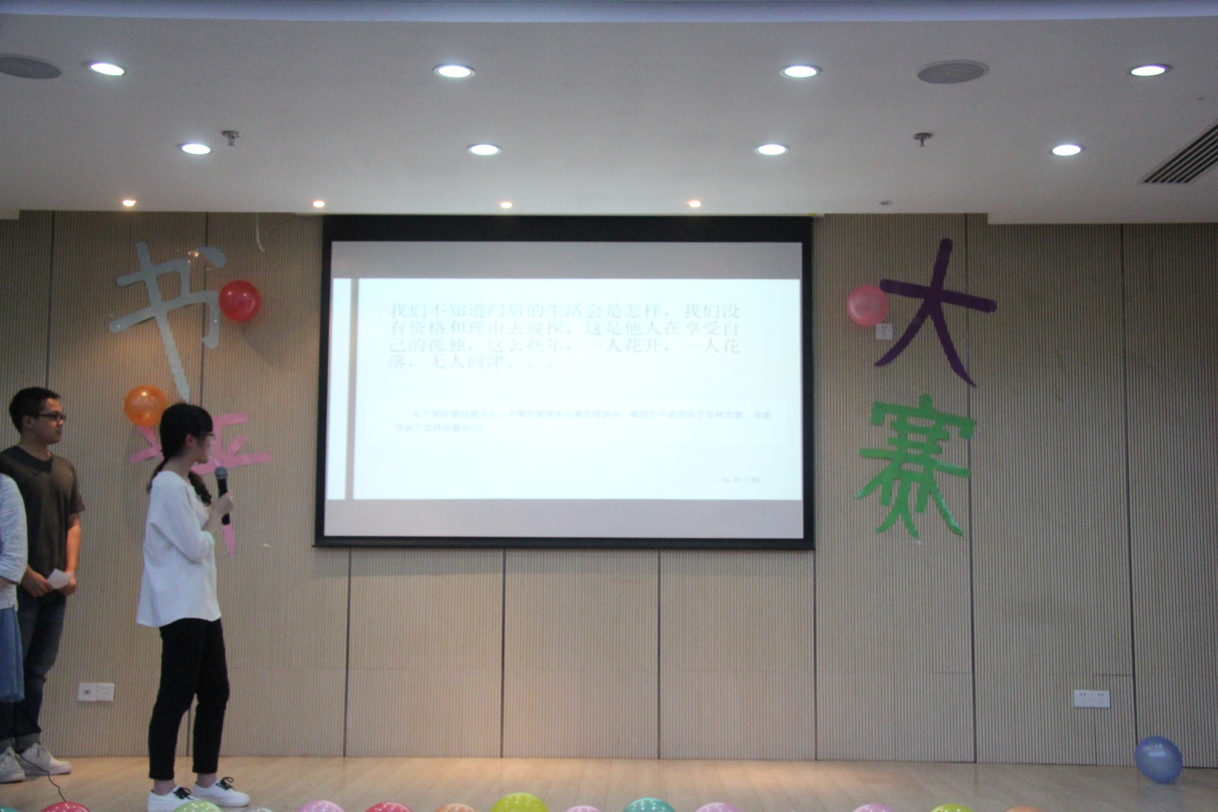 在第二个环节“我的书评我做主”中,每个小组选出一至三名成员对所选书籍进行讲解与评论。百万英镑小组对《动物庄园》进行了深刻剖析,从而引发了观众们对于社会和权力的思考。诗与梦小组以悲剧性为切入点,多层次分析了金庸的《天龙八部》,获得了评委们的一致赞许。神盾局小组用感性的视角来解读《伤心咖啡馆之歌》,为观众们讲述了一段畸形的爱情故事。三只小猪小组从毛姆的《月亮与六便士》中感受到了作者无奈消极的情绪,但她们幽默风趣的讲解方式给观众们留下了深刻的印象。各个小组完美的表现获得了在场观众们的热烈掌声。