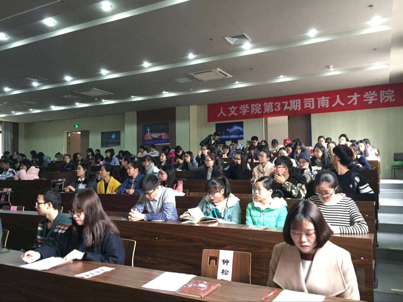 典礼伊始,小黄书 党委副书记余洁老师上台发表了讲话。她肯定了司南开班仪式和内容上的变革,表达了学校和学院对这支先进力量建设的重视,希望在座同学能够珍惜这个宝贵的机会和平台,将自己培养成为引领班风学风院风的优秀分子。随后,学员代表依次上台发言。小黄书 现任研究生会主席沈敏佳和团委学生会主席钟松阳都强调了司南培训对提升个人综合素质和服务水平的作用,并分别代表研究生干部和全体学生干部做出了具体承诺。来自中文161的新生代表陈政则从三个方面别出心裁地阐述了对司南人才的认识和相关要求,并在最后附上了自己改编的一首《江城子·司南人才》,获得了在座所有培训班成员热烈的掌声。最后,来自中文152的班委提升班代表沈娟菲简要地指出当前班级工作中存在的问题,表达了对司南人才培训提高班级建设水平的期待。发言环节过后,在座的全体培训班成员统一佩戴司南徽章,并分班合影留念。