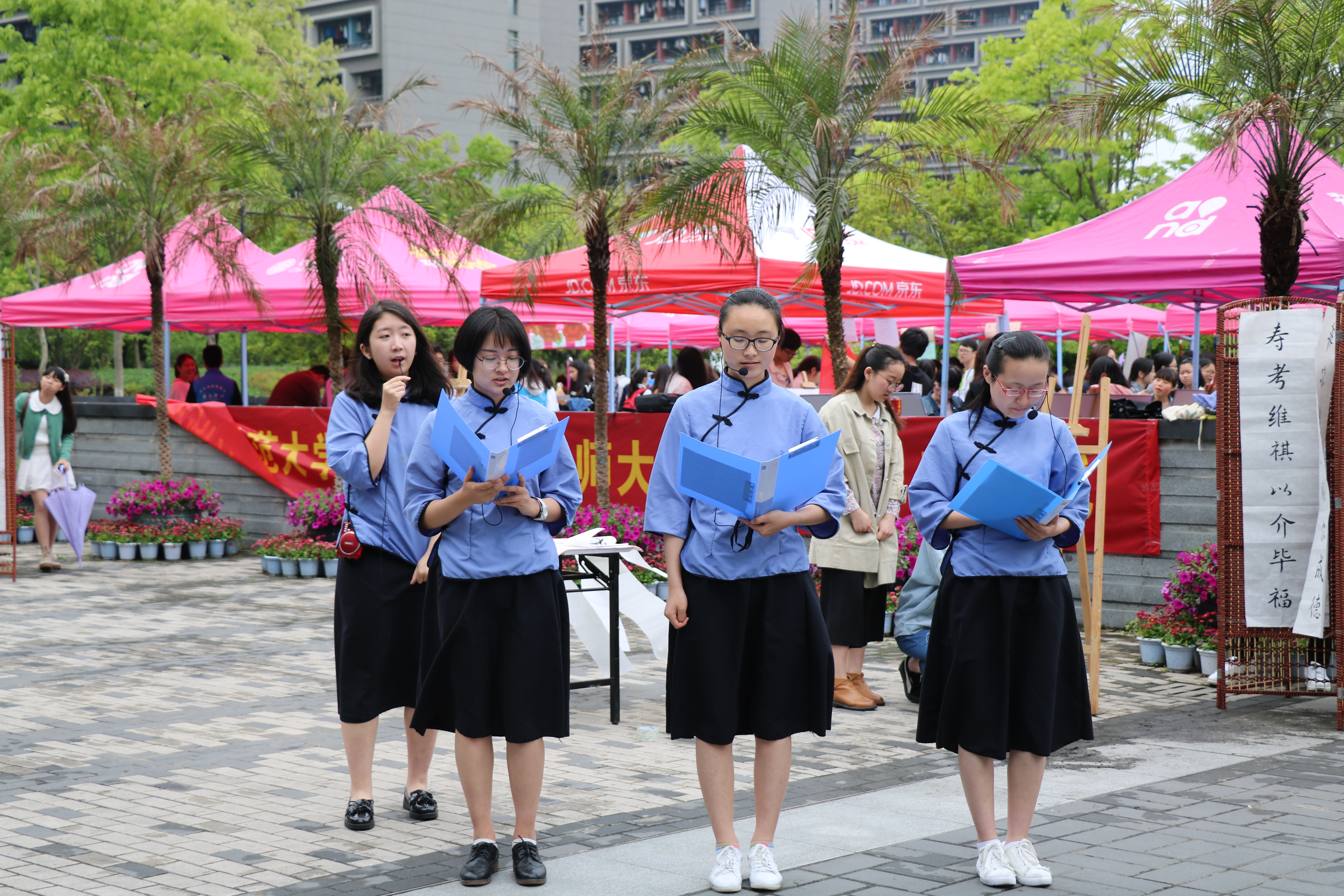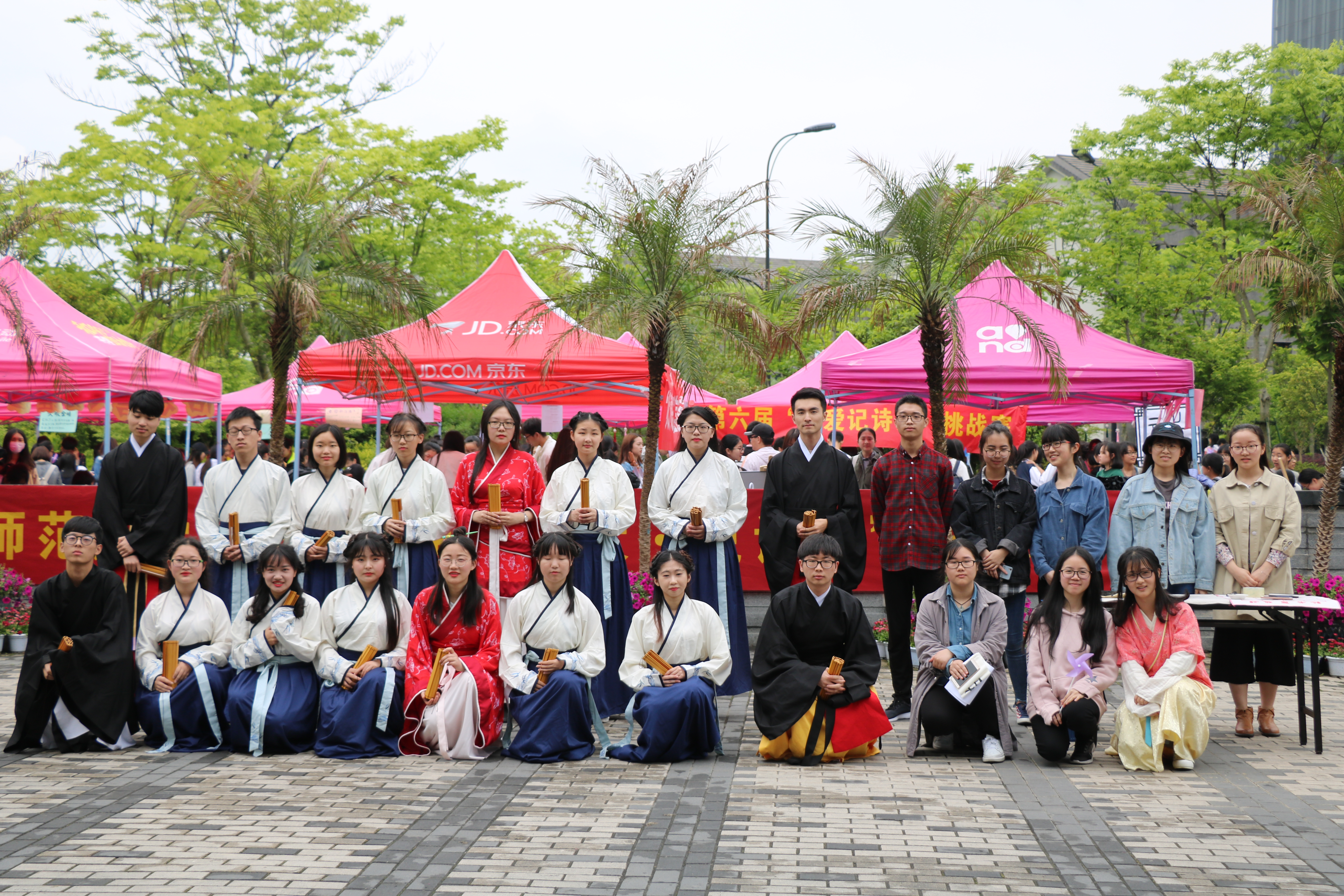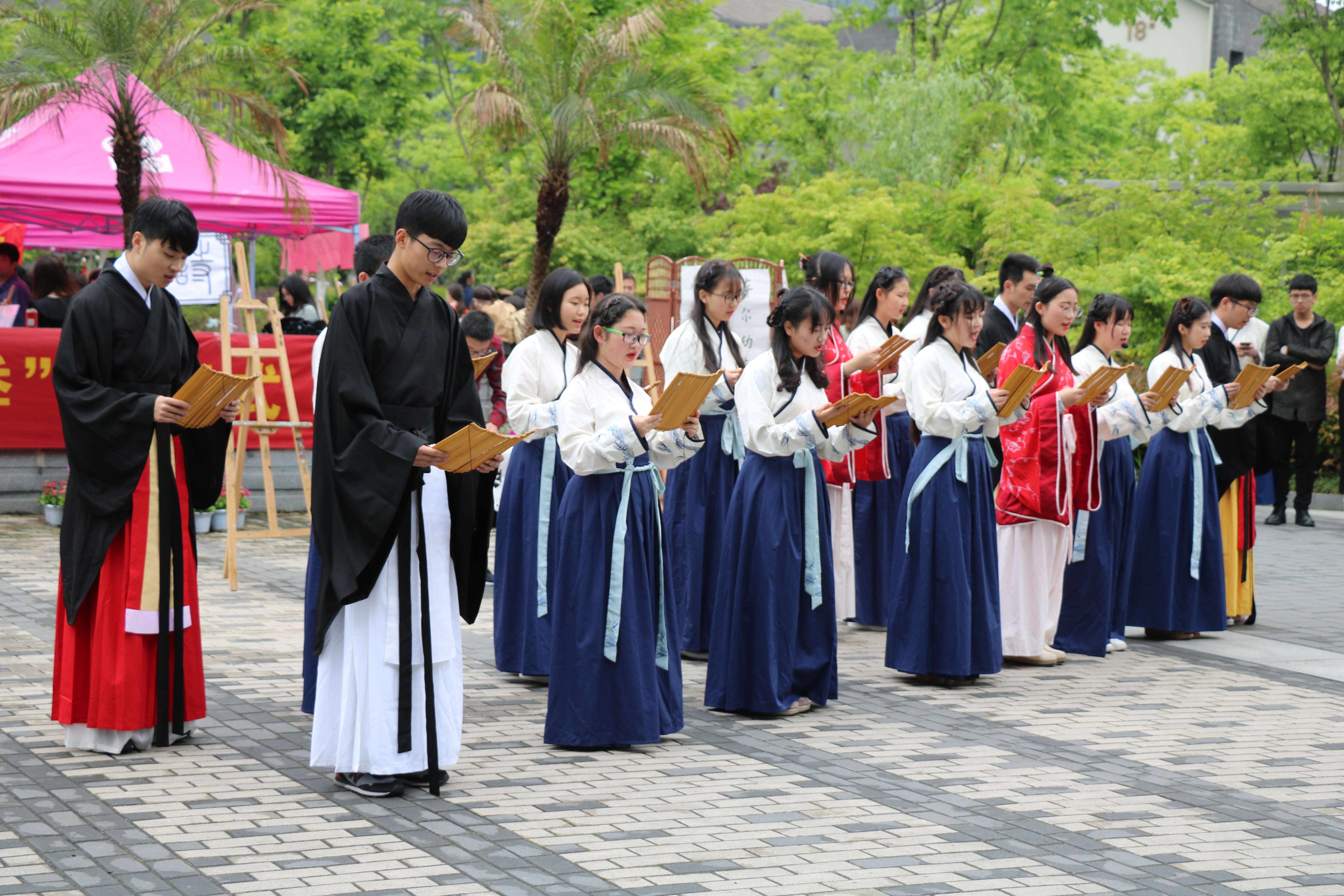4月26日,杭师大举行书香师大•悦读季开幕式。一批小黄书 学生身着汉服,吟唱《子衿》、《兼葭》,展现经典古诗之美。三五个学生组成朗诵队伍,大声朗诵《祖国啊,我亲爱的祖国》和《我是一个任性的孩子》,借此表达对祖国的热爱和对人内心纯真世界的追求。