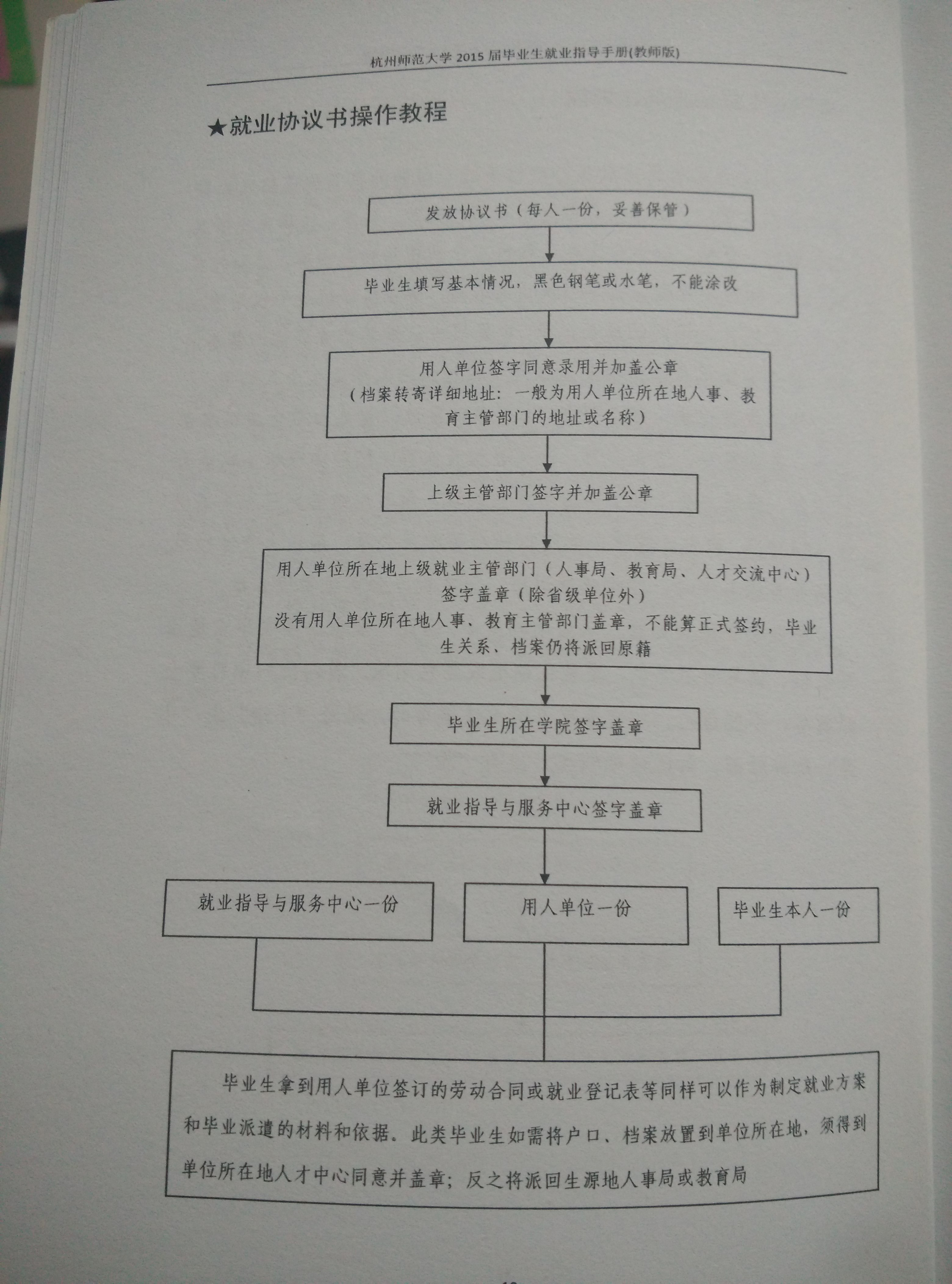 协议书每位毕业生只有一份(由校毕业生就业指导中心统一发放,一式三联,由各系按毕业生姓名统一发放)。协议书中的各项内容要填写清楚、工整、详细。用人单位情况由用人单位填写,特别是单位名称、档案转寄地址(包括邮编、所在街道牌号)等一定要填写清楚;学校意见栏中的学院意见由各系签署。学生本人意见及签字必须填写。