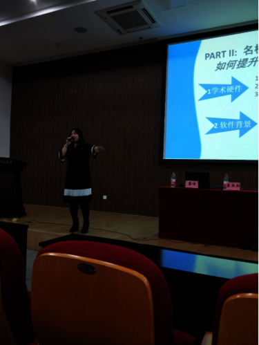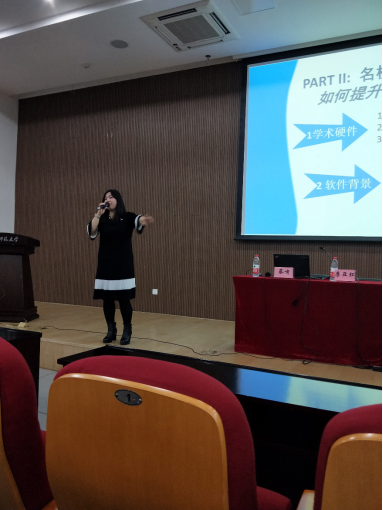 蔡啸老师首先向大家指明了当代大学生未来规划的主要种类,包括就业、 考研、出国等等。随后,蔡老师就如何确立职业目标做了具体的分析,并建议同学们根据“择己所爱”、“择己所利”、“择己所长”、“择世所需”等原则来确立目标。他通过视频分享,向大家展示了各大学和企业的特色优势,指出“定向也需要一定的宽度,不可眼光狭窄,更不能盲目自信或自卑”,“无论是就业、考研,都要不断拓展自身的综合素质,以促进自身全面发展”。紧接着,李亚红老师上台向大家介绍了出国留学的相关事项,她结合自身的留学经历,就留学要求、留学准备、留学意义等方面做了具体的介绍。当谈及国外院校的基本要求时,李亚红老师指出,“主要考察学生的学术硬件和软件背景等情况”。