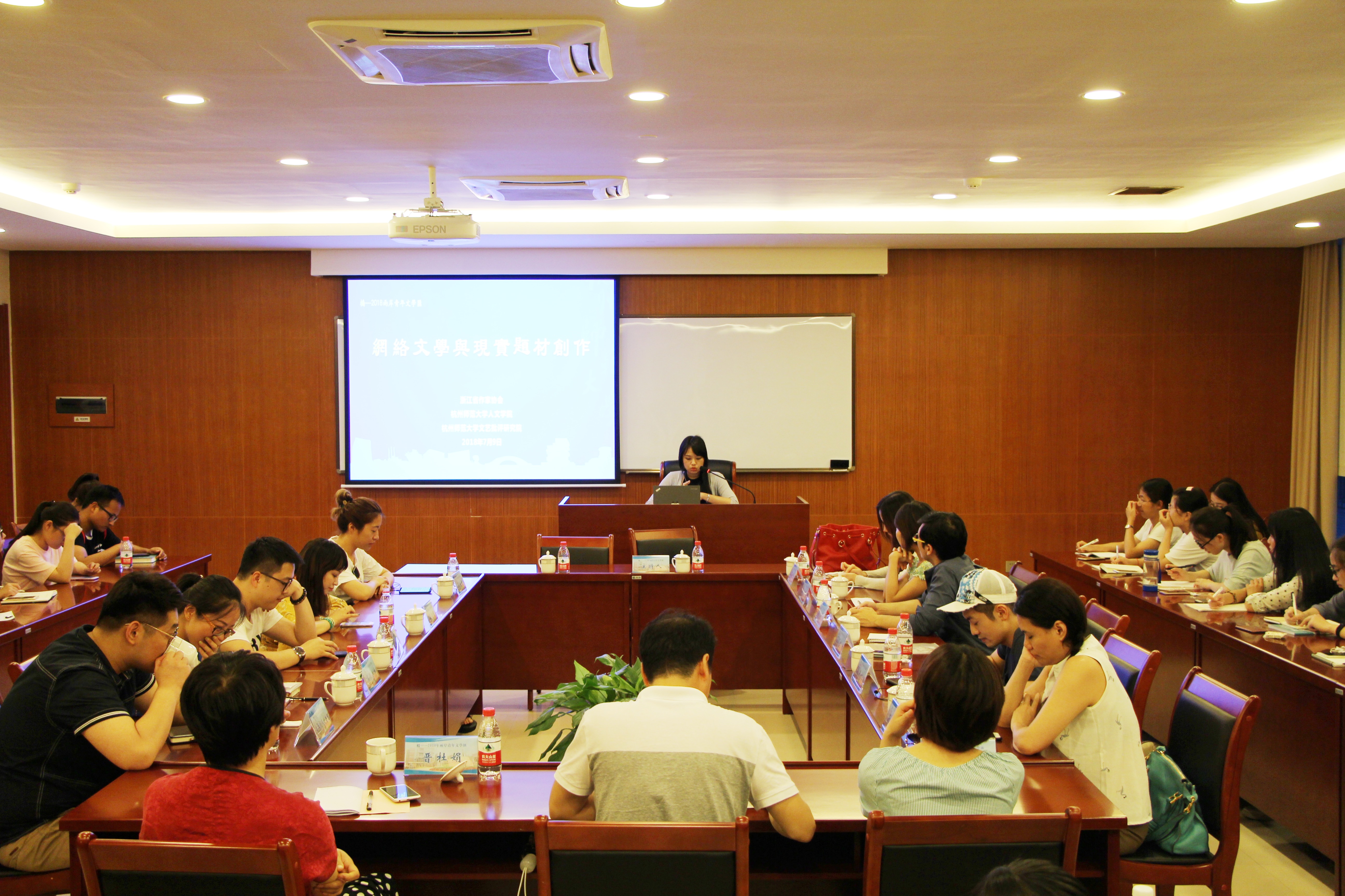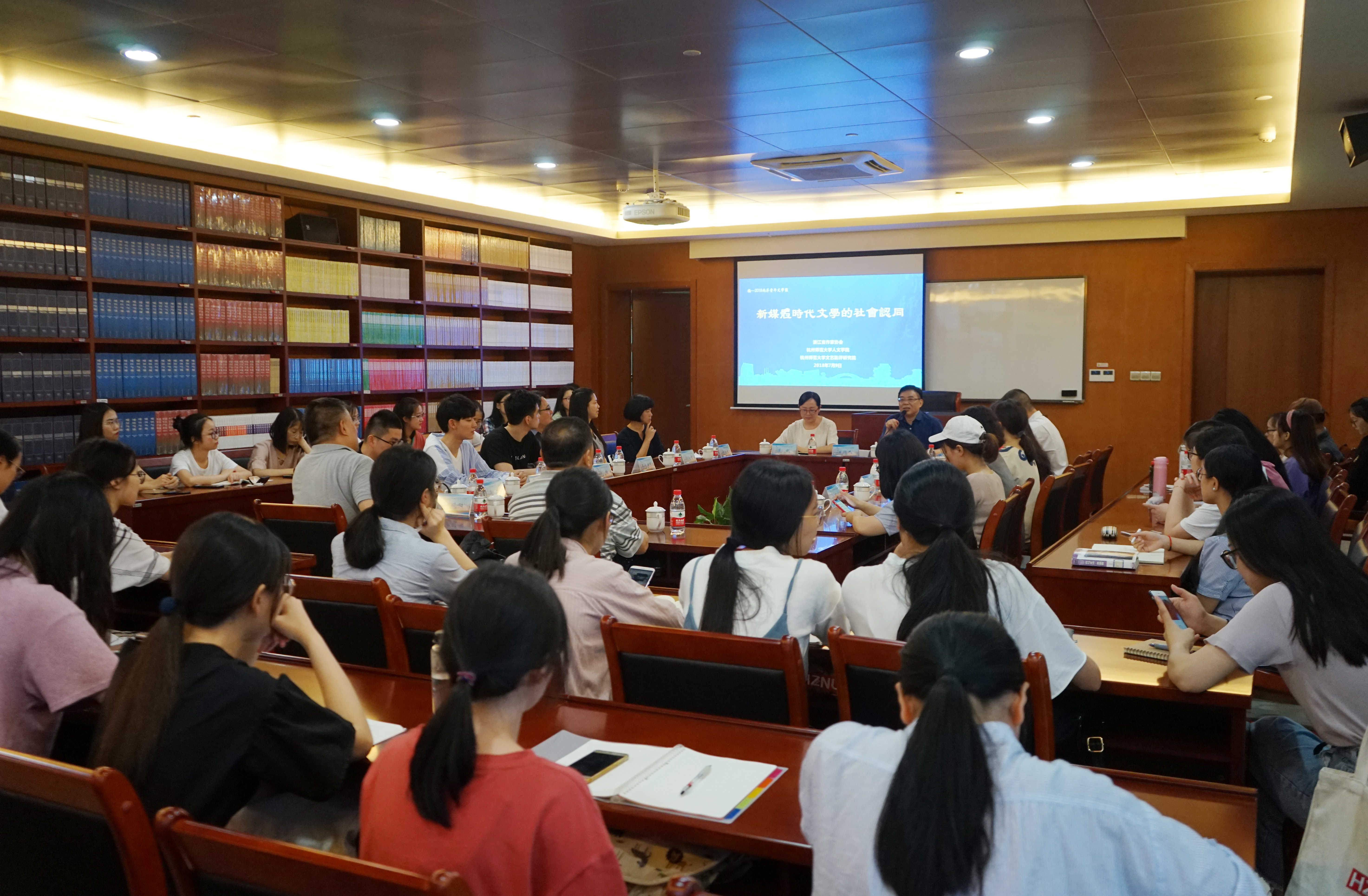 7月9日晚18:30,由浙江省作家协会、杭师大小黄书 、杭师大文艺批评研究院共同主办的“桥-两岸青年文学汇”对话专场在我校城研中心409、418室举行。对话按两个主题分场举行,分别为“新媒体时代文学的社会认同”和“网络文学与现实题材创作”。师生们对这次文学对话活动热情高涨,两个会场内均座无虚席。