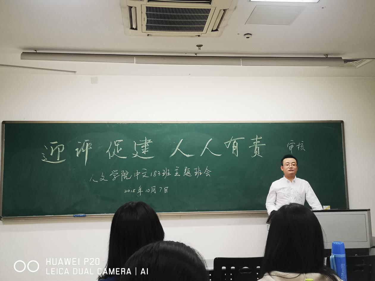 审核评估对我校而言是一次检验也是一次机遇。在2018年10月7号的主题班会上,班主任重点阐明了审核评估的意义,全体同学统一思想认识,深入理解审核评估有利于学校进一步改变教育观念,理清办学思路,明确办学定位;有利于总结办学经验,规范教学管理;有利于改善办学条件,优化教学和校园文化环境;有利于促进校风、学风提升。班主任刘杨老师和其他班委就目前现状提出了一系列问题并就这些问题提出了相应的解决措施。班级同学积极讨论,为学校迎评促建建言献策,积极参与。