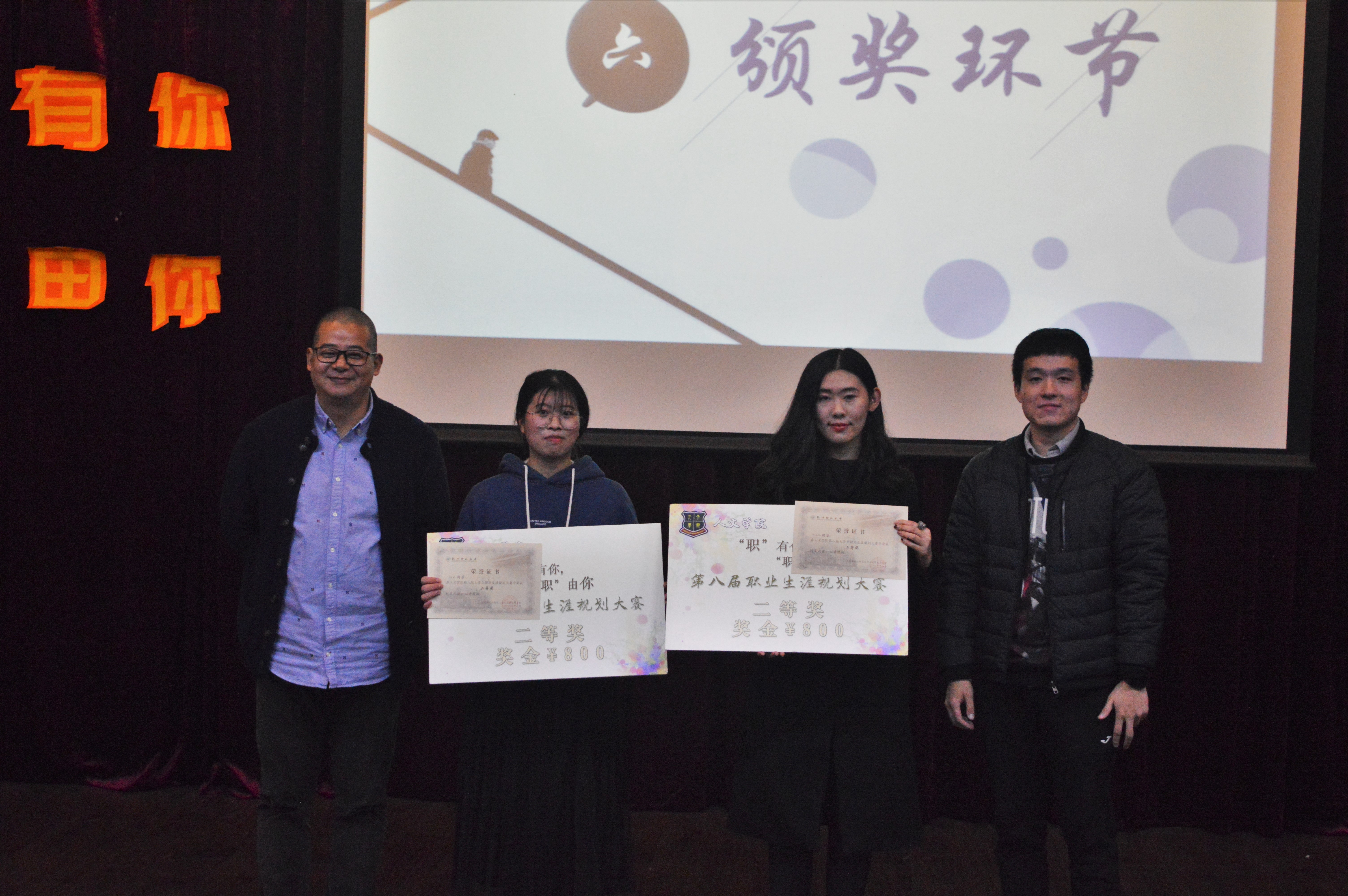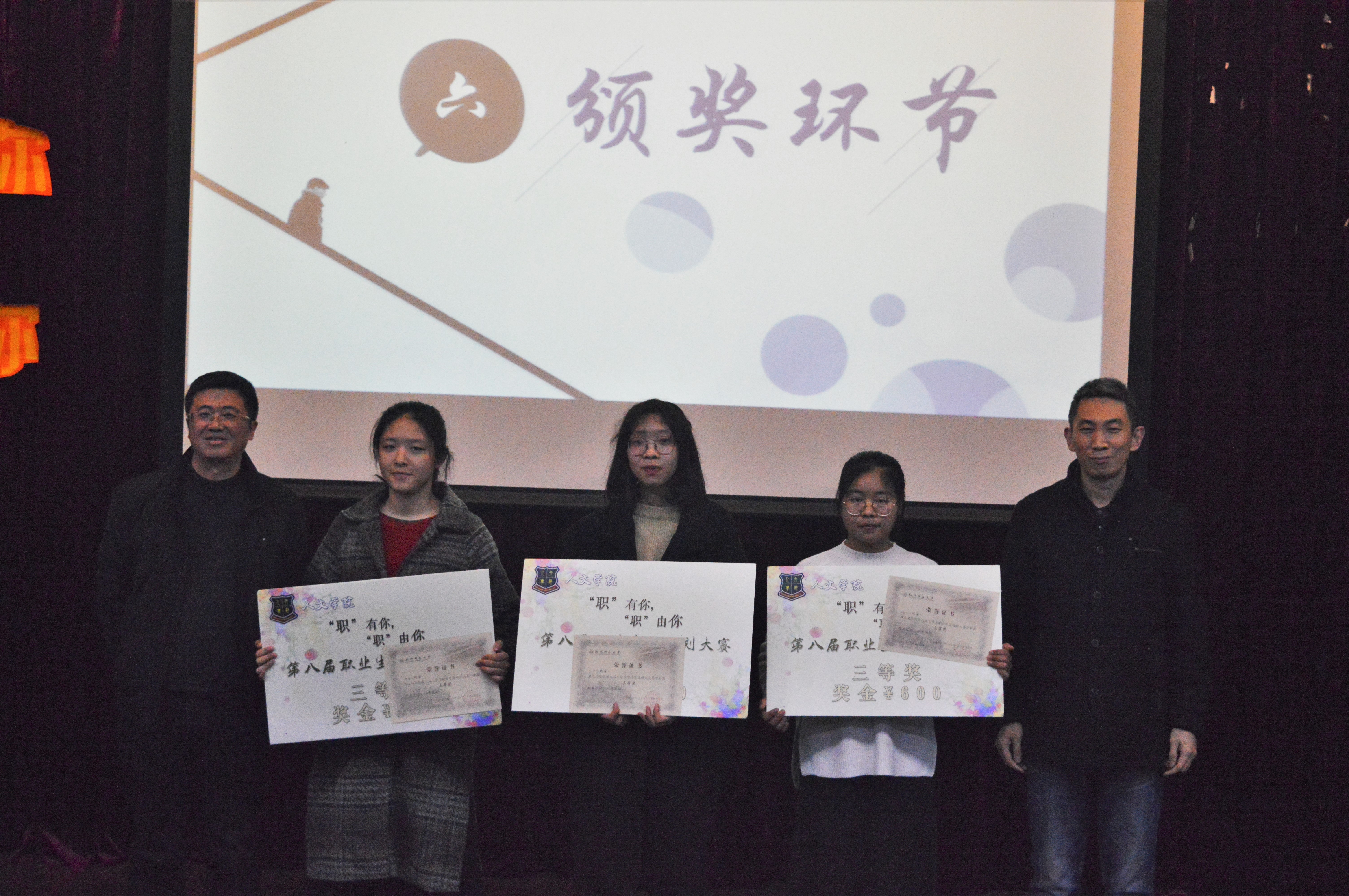 本次决赛以“‘职’有你,‘职’由你”为主题,经过初赛、复赛的选拔,六位选手脱颖而出进入决赛。决赛由选手们按抽签顺序进行10分钟的登台展示与15分钟左右的现场答辩两部分组成。决赛选手从职业市场环境、自我测评分析、不同时期规划、职业生涯风险等方面对自己的规划进行了全面而细致的讲述,展现出小黄书 学子朝气蓬勃的青年风采。每位选手在答辩环节也得到了评委嘉宾们的殷切鼓励与中肯独到的建议。最终,中文163班的竺世佑同学以其独特的戏剧表现方式和真挚的仁爱之心获得了此次比赛的一等奖,中文163班的吴安妮和中文161班的徐苏杭同学获得了二等奖,汉教181班的何昕怡、中文172班的陈思羽、人教171郭勤亿获得了三等奖。
