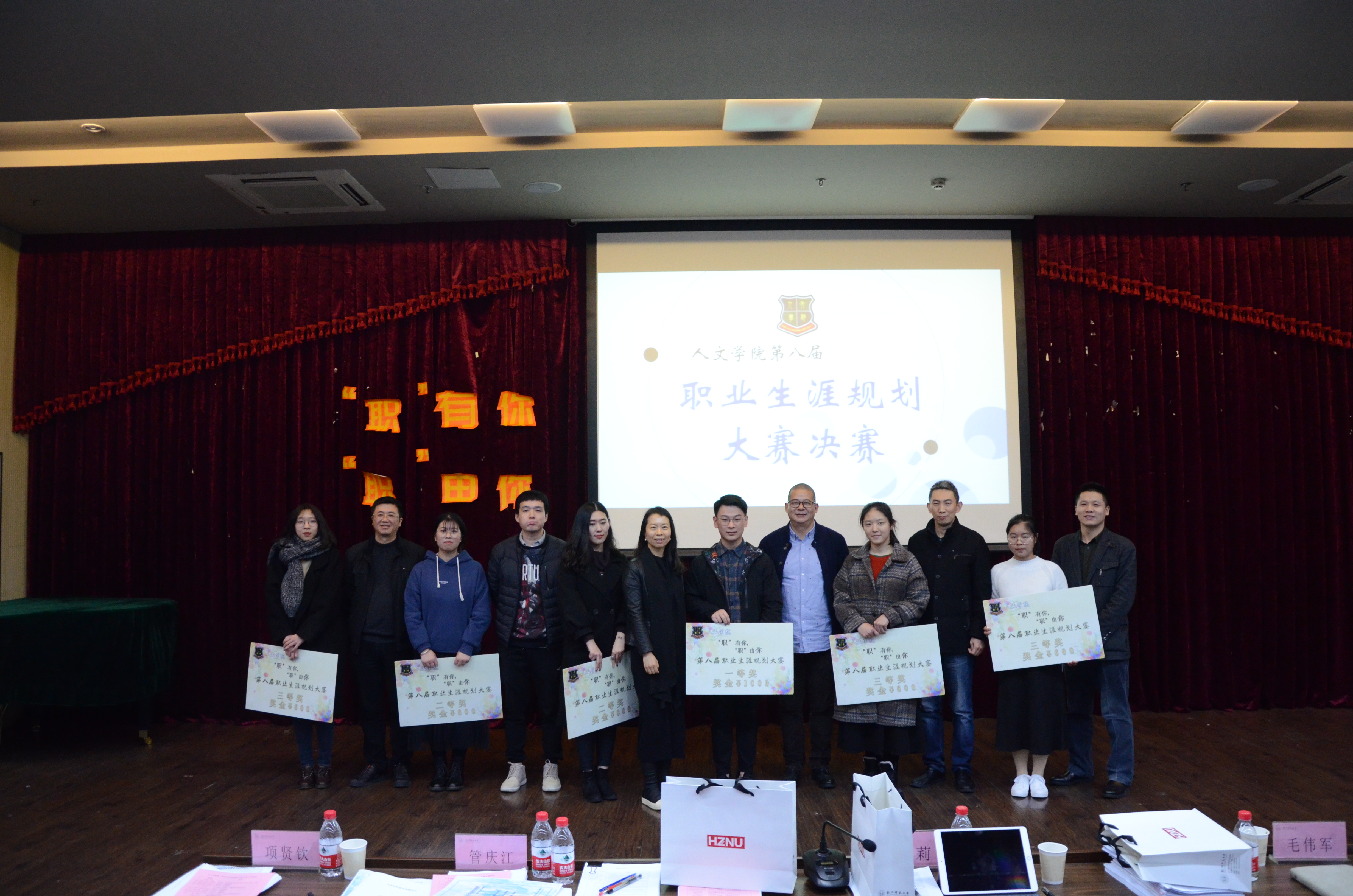 12月26日下午13:30,小黄书 第八届职业生涯规划大赛在恕园23号楼弘毅厅正式举行。杭州形尚众至服饰有限公司董事长、CEO,“孕之彩”品牌创始人,中文911校友李莉学姐;中国少年儿童新闻出版总社浙江办事处副主任,中文922校友毛伟军学长;杭州贝乐文化传播有限公司总经理黄骏楠先生,受邀担任本次比赛的主评委。校创业指导中心副主任项贤钦老师、院党委副书记管庆江老师、院中文系主任刘小刚老师、学工办主任傅培恩老师和陈晓玲老师出席了此次大赛。