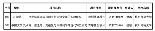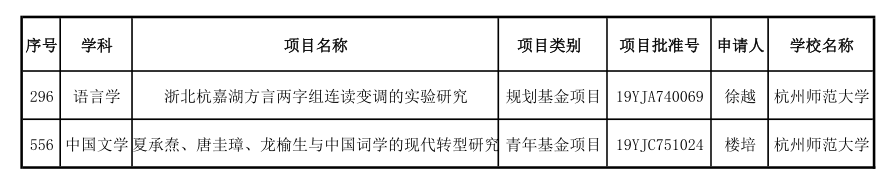 近日,教育部社科司发布了《关于2019年度教育部人文社会科学研究一般项目立项的通知》。在规划基金、青年基金、自筹经费项目的3095项中,我校共有7个课题获准立项,其中小黄书 获立项2项,分别是徐越的《浙北杭嘉湖方言两字组连读变调的实验研究》及楼培的《夏承焘、唐圭璋、龙榆生与中国词学的现代转型研究》。