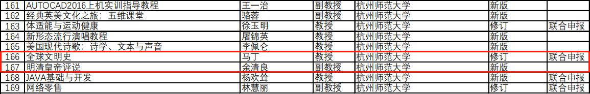 近日,浙江省普通高校“十三五”新形态本科教材(第二批)建设项目公布,小黄书 马丁的《全球文明史》和余清良的《明清皇帝评说》两门课程,获得立项。本次评选全省共产生本科357项,其中杭州师范大学共立项9项。