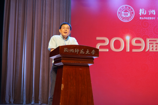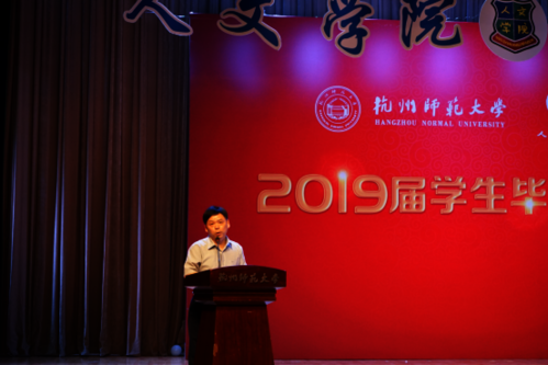 洪治纲代表学院向圆满完成学业的全体毕业生表示祝贺。他指出,告别总是感伤的,但人生总是在告别中走向新的世界。世界在你眼前,祝福在你身边。他分享了几个小故事,通过华为与美国的较量指出同学们要将眼光放高放远,让自己足够卓越,同时要具有非凡的胸怀去看待事情;通过华为启动备胎计划后各大技术人员的日夜奋斗,指出了中国人的血性、勇气与情怀,强调了人文学子应该具备情怀,不要向压力、困难低头,要像华为人一样,所有的困难都能唤起我们奋争的激情,所有的曲折都会变成我们的斗志。他以武侠小说家金庸的一句“人生就是大闹一场,然后抽身而去”真诚祝愿学子们不负青春、不负热血、不负情怀。同时他以《论扯淡》为例子,强调了追问的价值,要求同学们努力思考,只有在不断发掘思考,才能在逼近真理的道路上让人生闪耀耀眼的光芒。