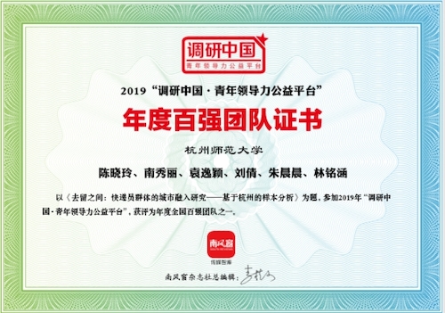 截至6月,南风窗2019年“调研中国”大学生暑期社会调研实践活动全国百强名单揭晓,小黄书 南秀丽、袁逸颖、刘倩、朱晨晨、林铭涵等5名同学申报的《去留之间:快递员群体的城市融入研究——基于杭州的样本分析》项目经过层层筛选,成功入选全国百强。