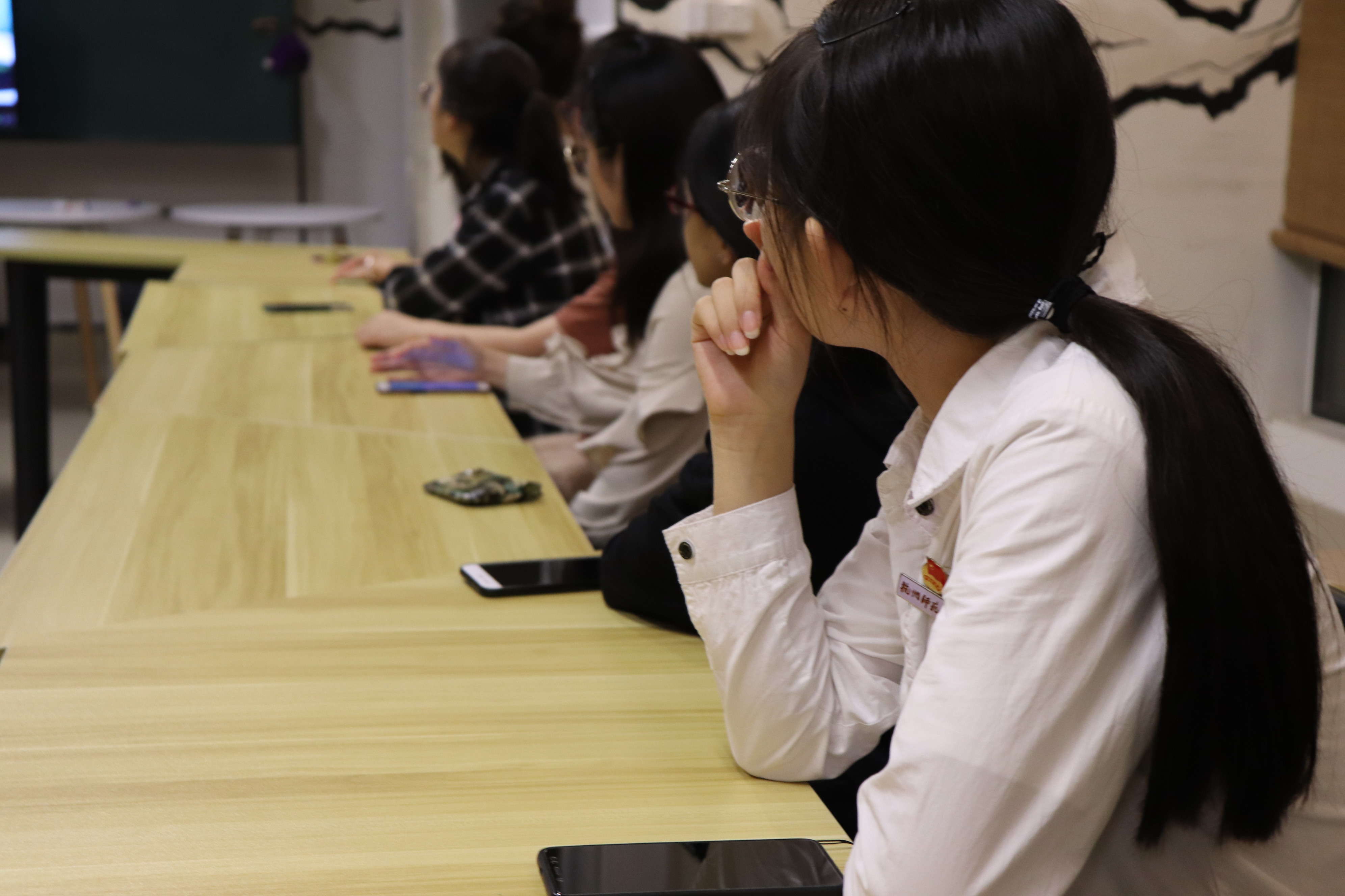 体味共和国的成长,回首个人入团历程,在支书吴惠悦的组织下,全体团员佩戴团徽,高举右手,庄严宣读入团誓词;随后,在周佳琪的指挥下,再次唱响共青团团歌《光荣啊,中国共青团》。