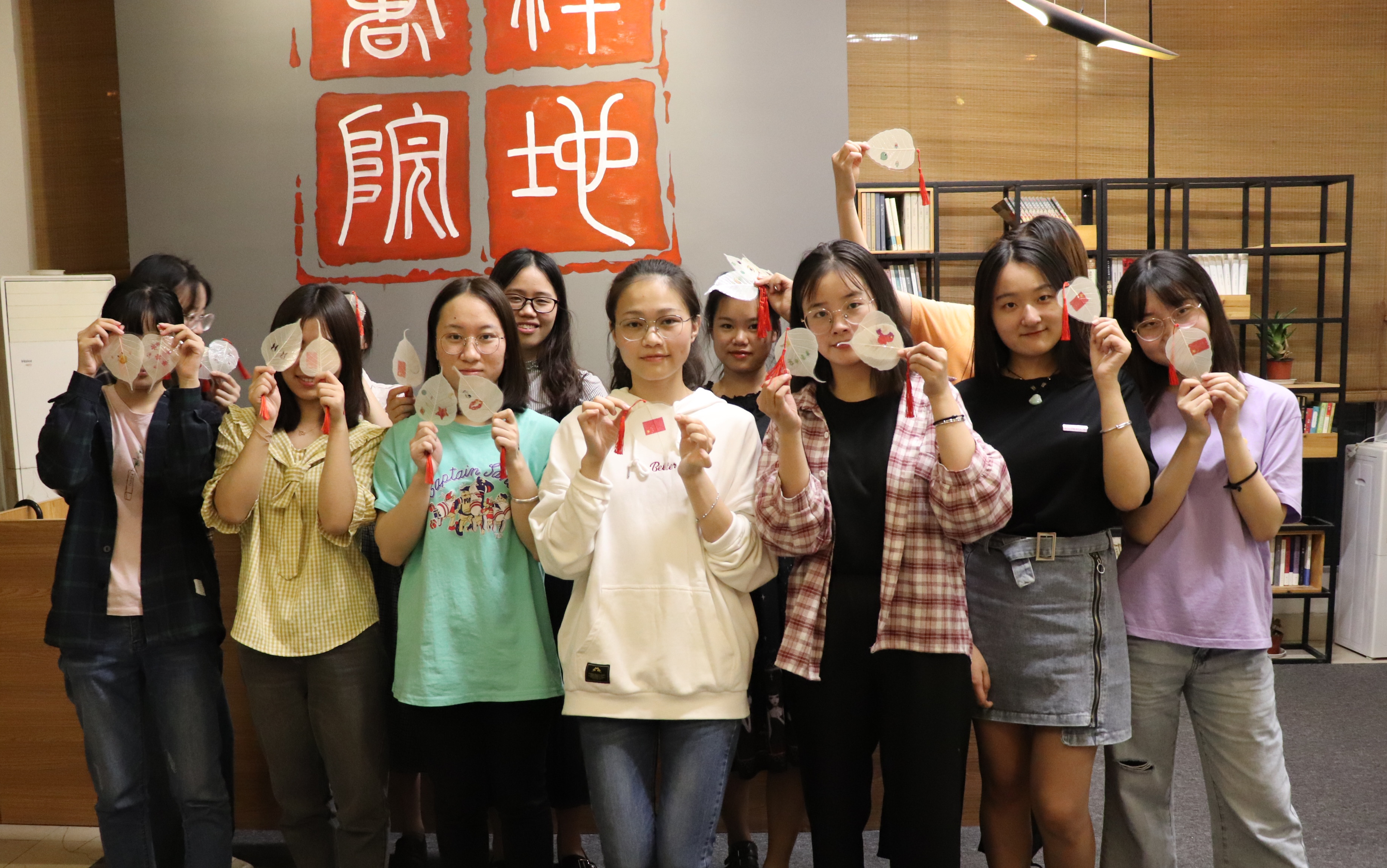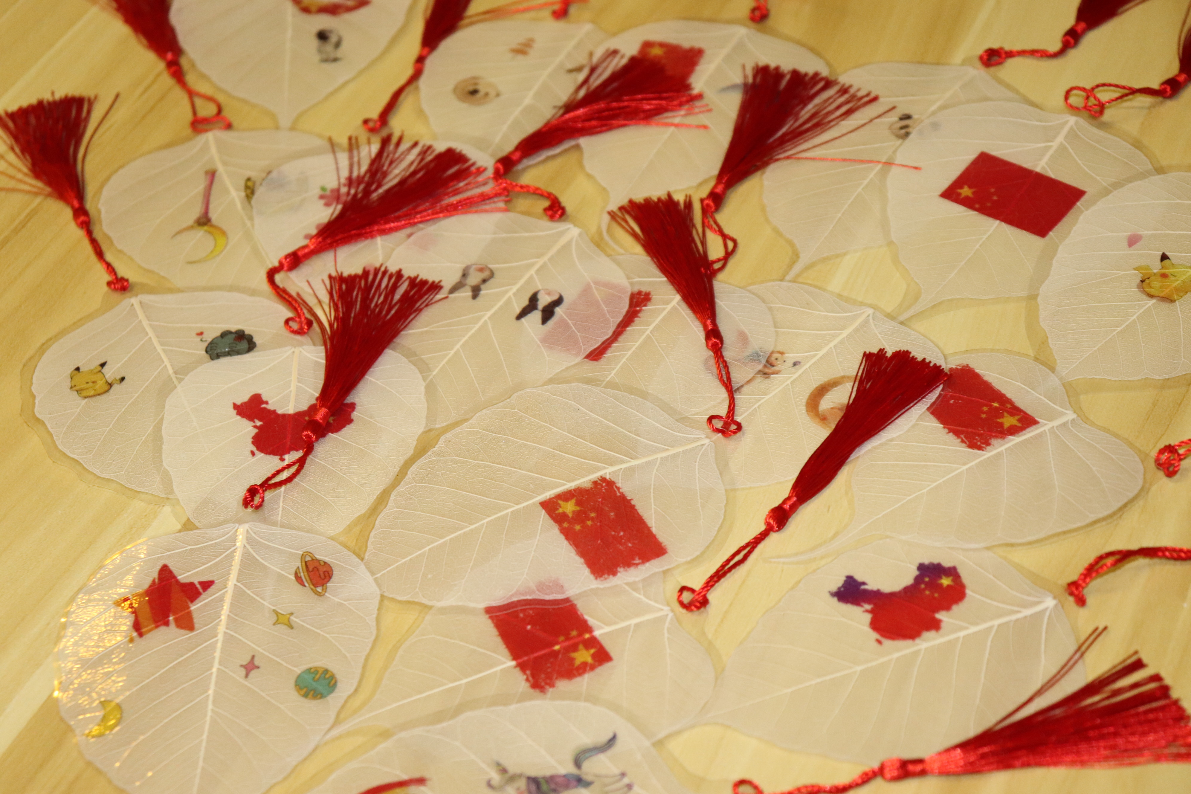 班会的最后一项活动,是大家一起制作精品叶脉书签,拓印、塑封、打孔、挂红绳,国旗、地图、兵哥哥等可爱的图案便印上了书签。除了留一件留念以外,我们也会在国庆节之际将其他叶脉书签送给杭州市儿童福利院的孩子,鼓励他们快乐成长、好好学习、热爱祖国。(文/图 陈渊)