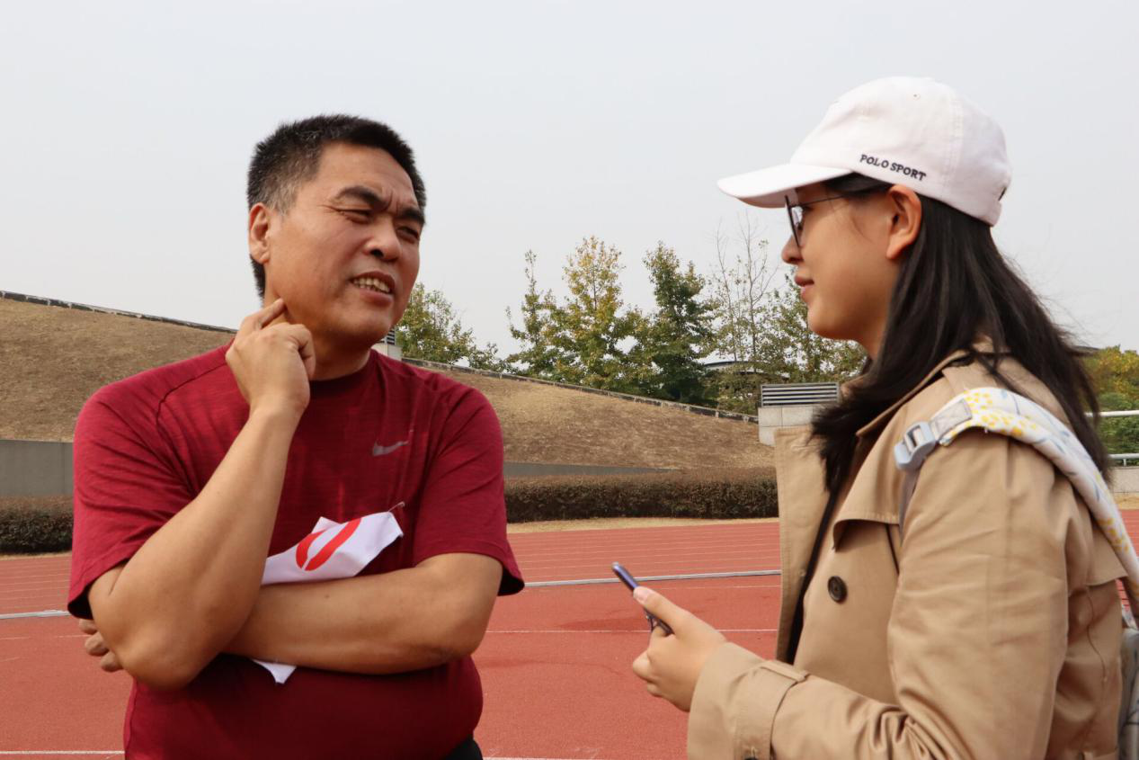 赛前,郭老师心态良好,与“对手们”有说有笑,正符合了中文193班同学们所描述的和蔼可亲的形象。谈及此次运动会,他告诉我们:“运动会重在参与,开心就好,不必刻意追求名次。”