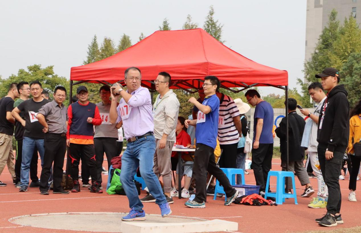 伴随着激昂的进行曲,竺建新老师步入赛场,自信依旧,在试赛中尝试了铅球运动,不断调整姿势以达到最好的效果。正式比赛时,在赛场上不慌不忙,镇定地走上掷球赛场上,调整好状态,目光坚定的看向前方,用力一掷,铅球在秋日阳光下发出银色的光泽,“嘭”的一声,铅球落在了白线内,周围加油的同学鼓着掌,竺建新老师微笑应对。虽然无缘决赛,但竺建新老师表示参与是最重要的。