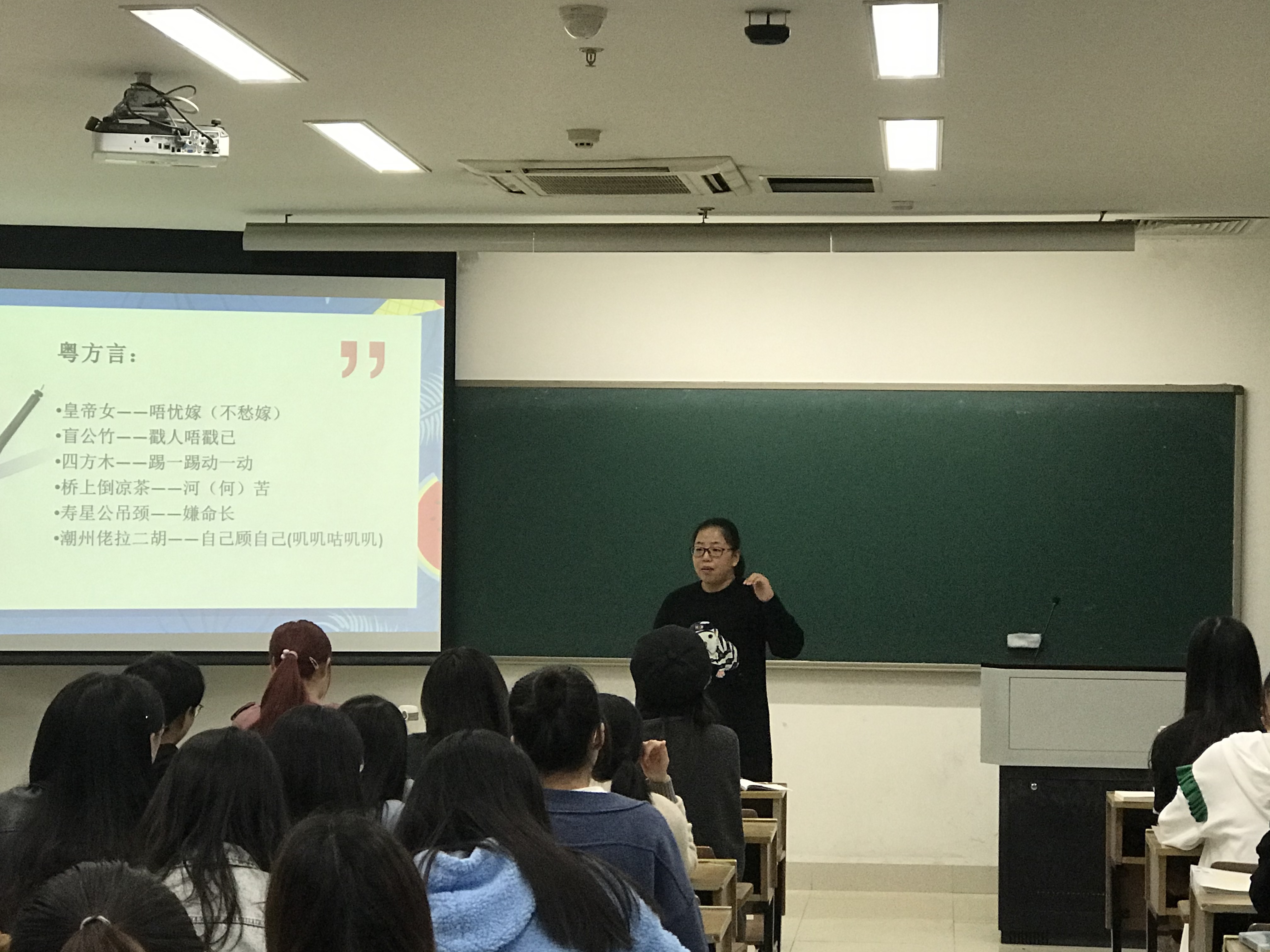 课程分两个部分,首先,学生以小组为单位,分别上台讲解家乡方言和美食,学生课前准备充分,用PPT、视频、电影配音等方式,生动形象的展现了方言的特色和魅力。第二部分,张薇以畲族与畲话(畲语)为例,深入讲解了地方方言变化和迁移的过程;在讲到语言、语系分类的部分,张薇以“杭州话——带官话色彩的吴语”为例,重点讲解了移民的旧地方言和新地方言相融合,并介绍了基本词汇和语法结构的变化。课后听课教师反馈,充分肯定了张薇上课的优点,课程教学安排合理,与学生互动良好,能充分调动学生积极主动性。在重难点内容讲解上,能将科研成果与课堂教学很好的结合,通过一个个形象生动的案例,将方言迁移背后的逻辑分析透彻,学生聚精会神,专心致志,教学效果突出。