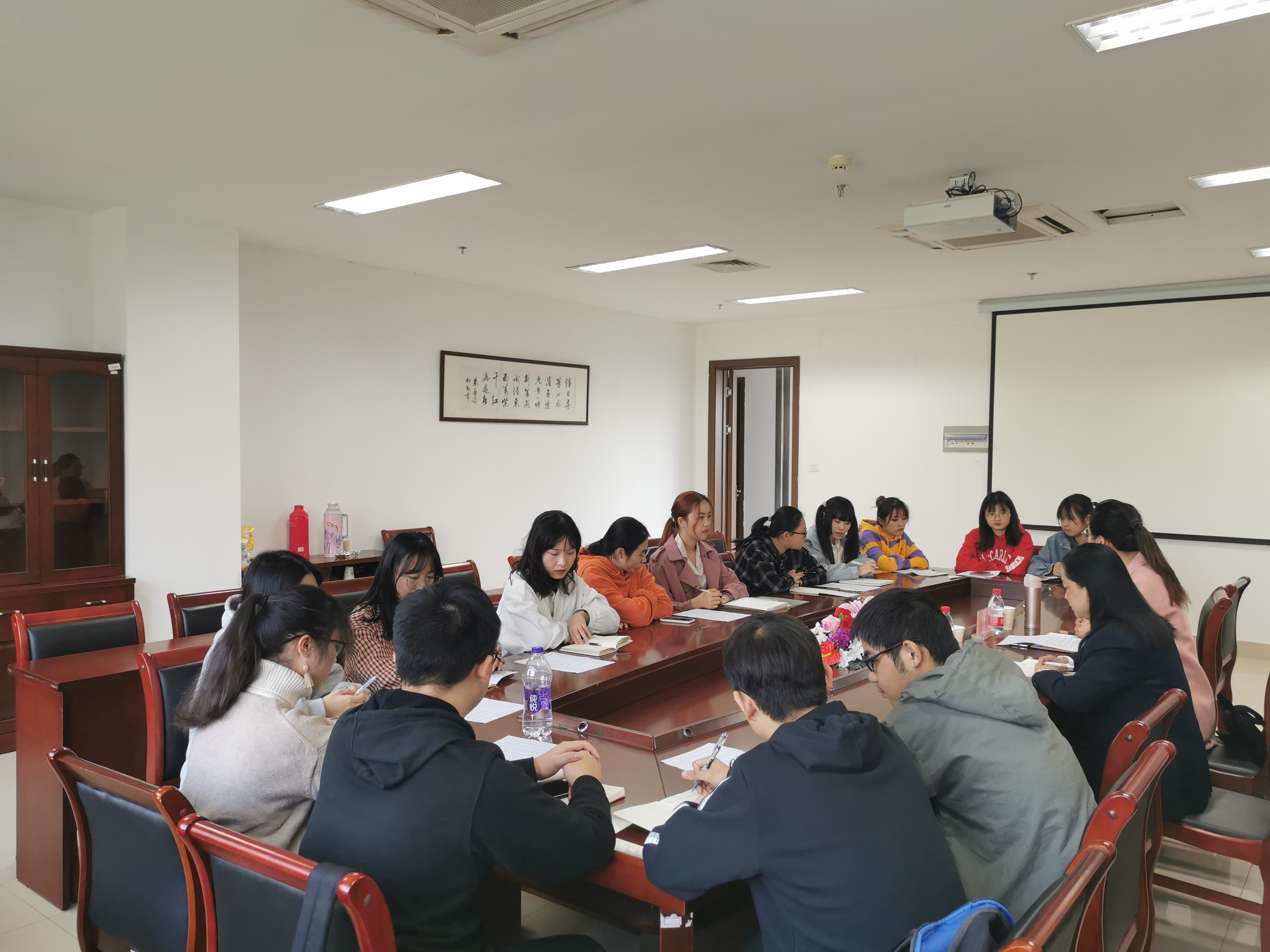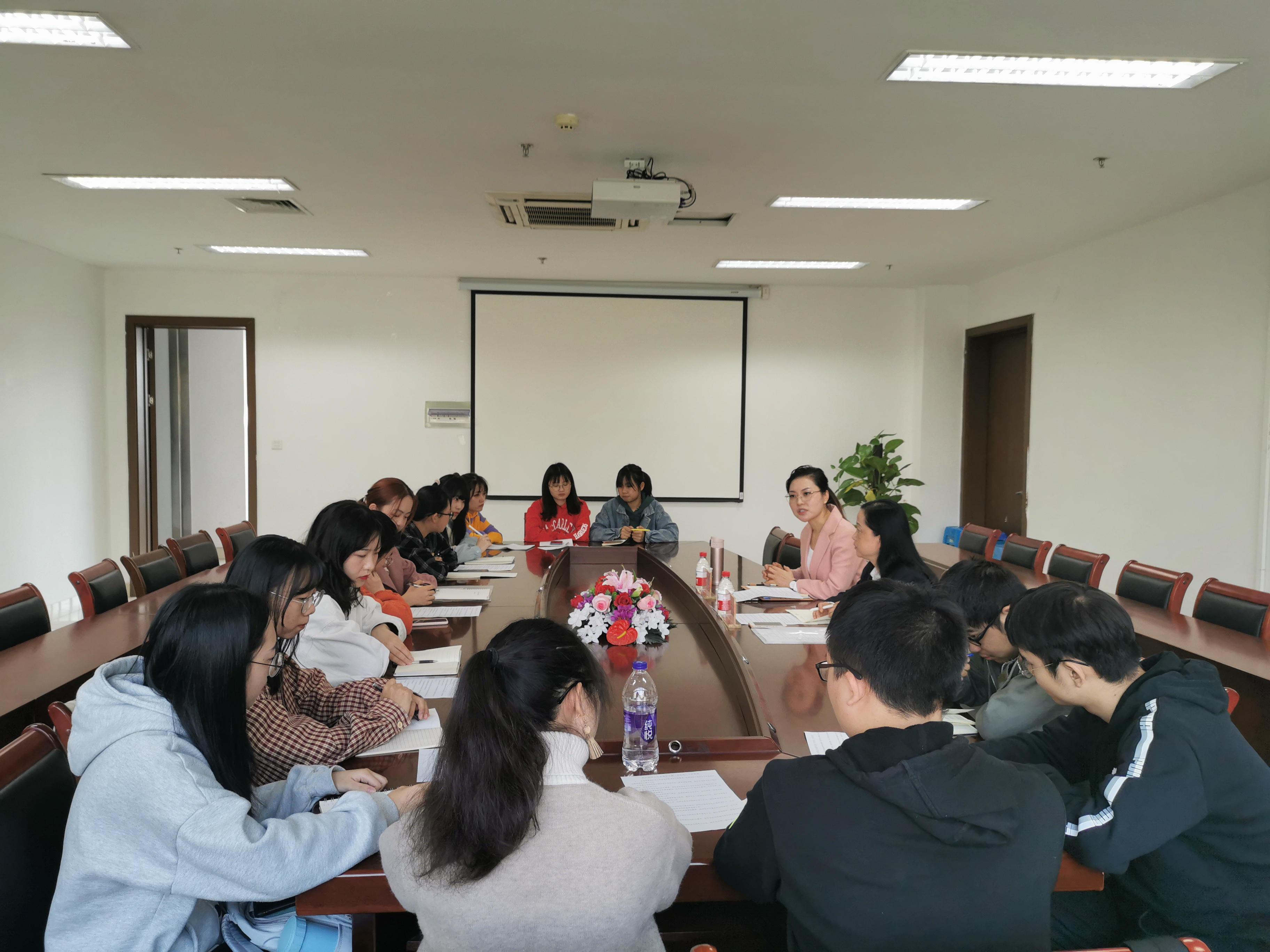 11月15日下午15:30,校党委学工部副部长翁灵丽来小黄书 与学生座谈,学工部资助科科长惠秀陪同。院党委副书记管庆江热情接待。院学生组织主要学生干部、各班级学生代表等14人参加了此次座谈。