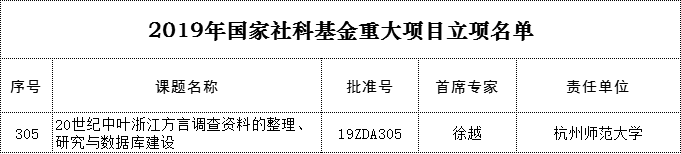 2019年度国家社科基金重大招标项目立项名单于12月4日公布。小黄书 徐越教授担任首席专家的“20世纪中叶浙江方言调查资料的整理、研究与数据库建设”课题获得立项,是我校所获批的3项课题之一。