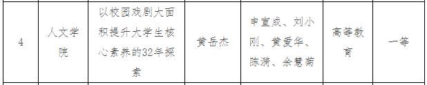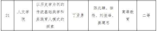 近日,校教务处公布了2019年校级教学成果奖评审结果,小黄书 黄岳杰老师负责的项目《以校园戏剧大面积提升大学生核心素养的32年探索》获得一等奖;丁贤勇老师负责的项目《以历史学为例的传统基础类学科实践育人模式的探索》获得二等奖;陈新民老师负责的项目《历史与社会综合性学习研究》获得二等奖。