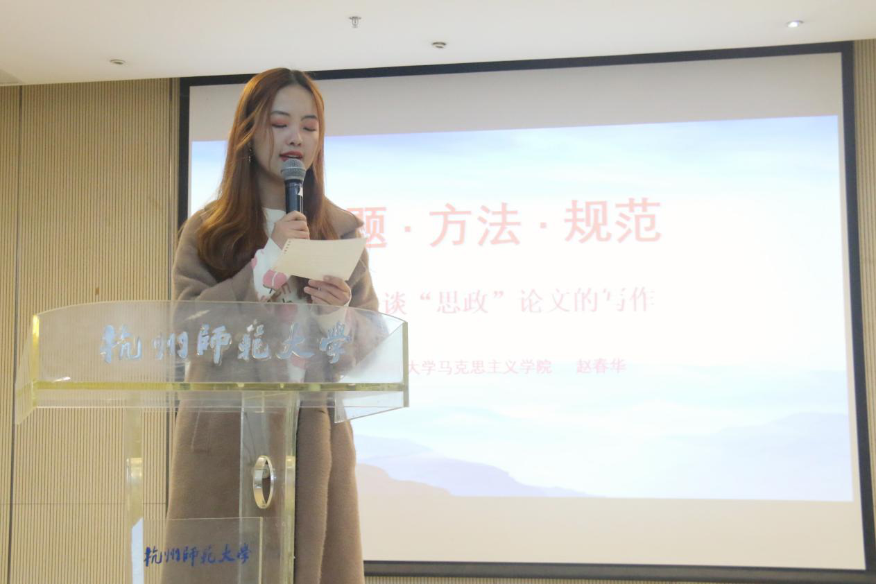 赵春华教授介绍了第二十二届学生思想政治理论课优秀论文竞赛,并强调了选题的重要性。他指出,选题应在参照竞赛通知论文指南的基础上,重视思想性、针对性、时效性、科学性与创新性。针对往届竞赛的投稿,赵教授主张论文写作要贴近时代发展与当代大学生生活,在合理的研究范围下,追求论文的新颖性与可研究性。同时,他以五种标题形式的例子突出论文标题要贴切文章,概括内容,反映性质。其后,赵教授介绍了规范研究方法和经验研究方法这两种社会科学研究方法,并鼓励同学从数据库的论文资料、历届比赛的优秀论文、优秀教师的指导中学习思政论文的写作方法。在思政论文的格式规范方面,赵教授从三个角度讲述了论文写作的注意要点,并强调了学术规范的重要性。