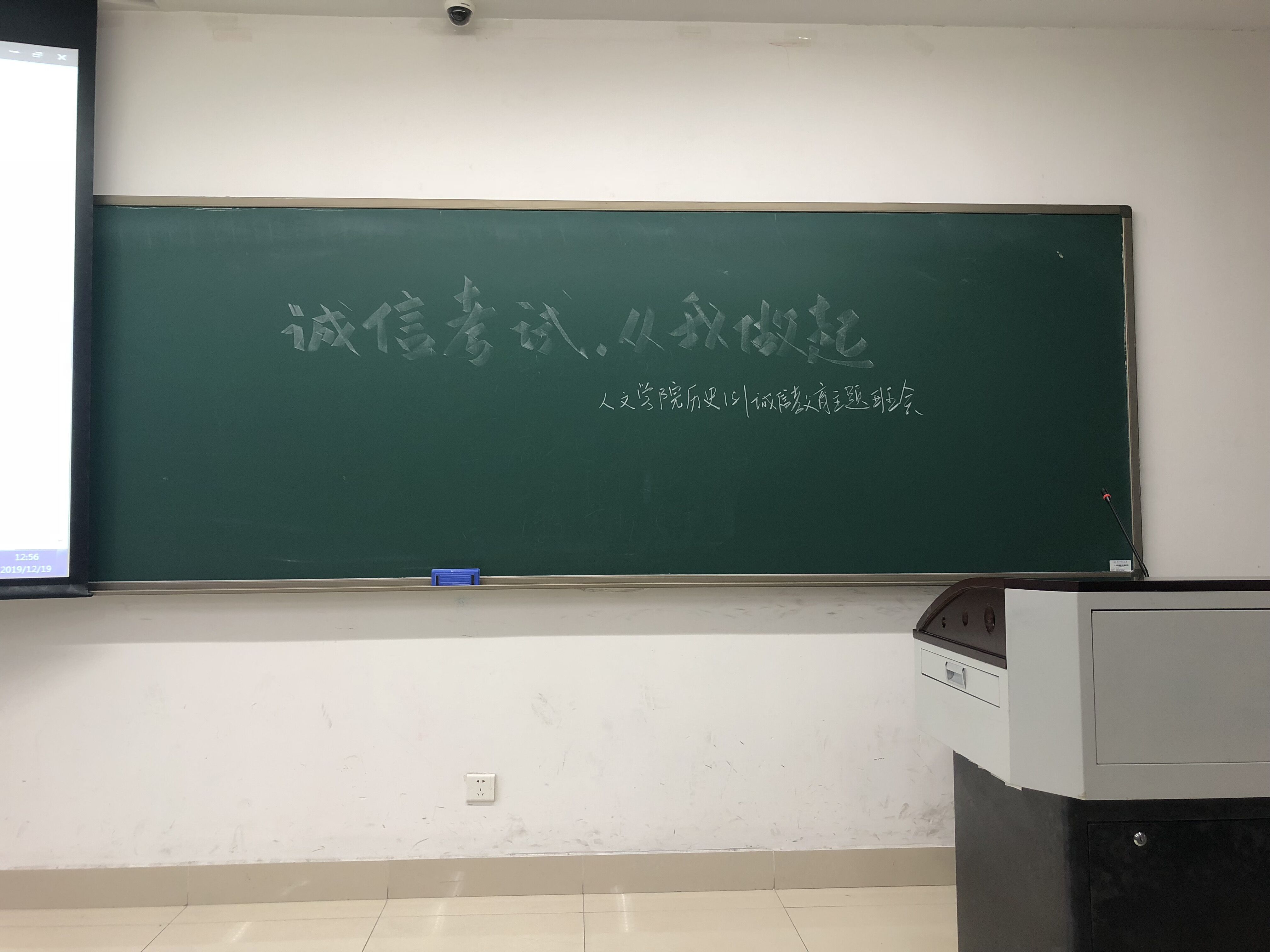 2019年12月19日,为响应学校进一步加强学生诚信教育,建设优良学风的号召,培养同学们诚信考试的素养,从思想上扎实诚信考试观念,从行动上落实诚信考试要求,历史181班举行主题为“诚信考试,从我做起”的班会。钱志坤老师出席本次班会活动,历史181班同学全体到场。