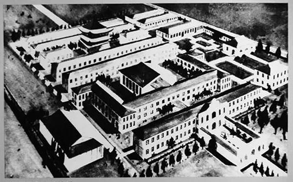 教学大楼的左侧,是一幢倒凹字形结构的三层男女学生宿舍楼,不仅与主楼同样飞檐吊角,精美别致,女生宿舍里还配备了当时难得一见的抽水马桶。在倒凹字形的中间地块上,工匠们精心地将其整理成一个花园。学生倚窗而望,地上草木繁茂,姹紫嫣红。