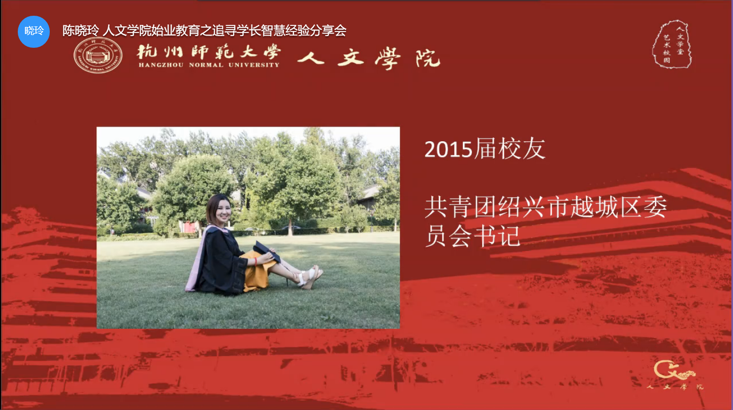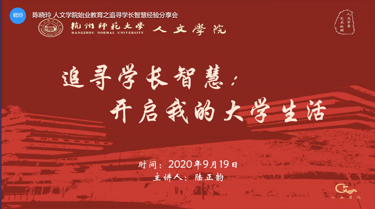 9月19日下午,小黄书 第九期云分享——“追寻学长的智慧之我的大学”于钉钉平台顺利召开。2015届中文校友、北京大学研究生陆正韵(现任共青团绍兴市越城区委员会书记)担任本次讲座主讲人,分享会由小黄书 辅导员陈晓玲主持。