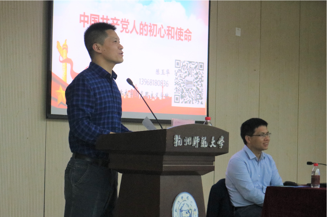 10月18日晚,小黄书 在恕园2号楼113教室举行“中国共产党人的初心和使命”主题讲座。浙江工业大学马克思主义学院副教授、马克思主义理论专业与公共管理专业(MPA)硕士生导师陈玉华应邀主讲本次讲座,党委副书记兼纪委书记管庆江、辅导员李悦及小黄书 20级全体新生参加会议,讲座由管庆江主持。