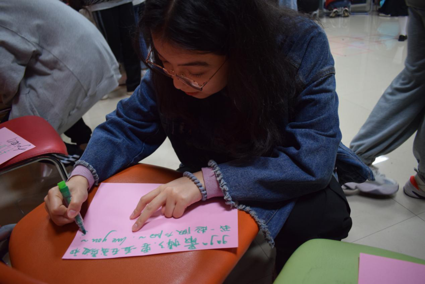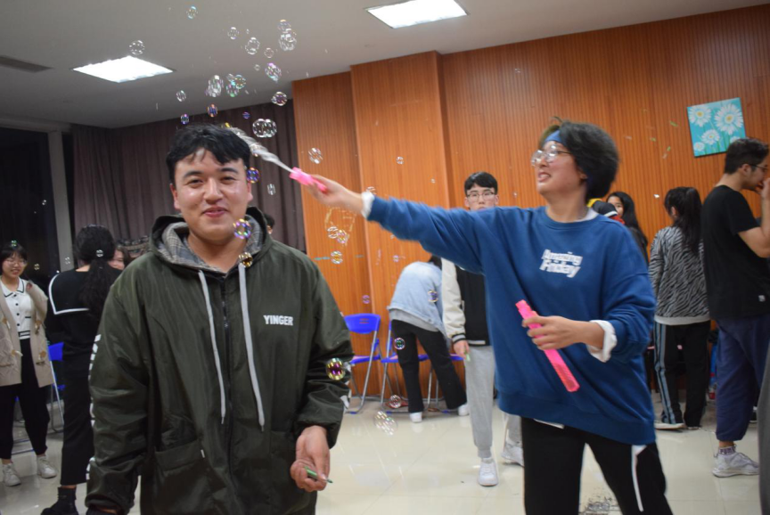 活动开始前,先到的同学帮助主持人将椅子围成圈后,玩起了吹泡泡游戏,直呼“回到童年”。待全班落座,活动正式开始。首先,主持人对此次活动规则及注意事项进行说明。随后,“大风吹”、“seven up”、“小小厨神”、“一元五角”等互动游戏陆续展开,同学们兴致高昂,积极参与,圈内欢声笑语不断。最后,主持人以 “留言板”游戏为活动作结,每位同学都收获了来自这个“友谊圈”的留言。