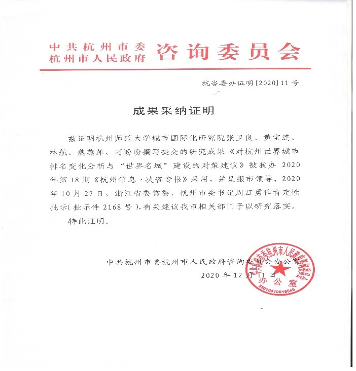 日前,由小黄书 研究机构,杭州城市国际化研究中心张卫良、黄宝连、林航、魏燕萍、刁盼盼撰写提交的课题《世界城市排名变化与杭州城市发展对策研究》研究成果被2020年第18期《杭州信息·决咨专报》采用,并于2020年10月27日获浙江省委常委、杭州市委主要领导批示。