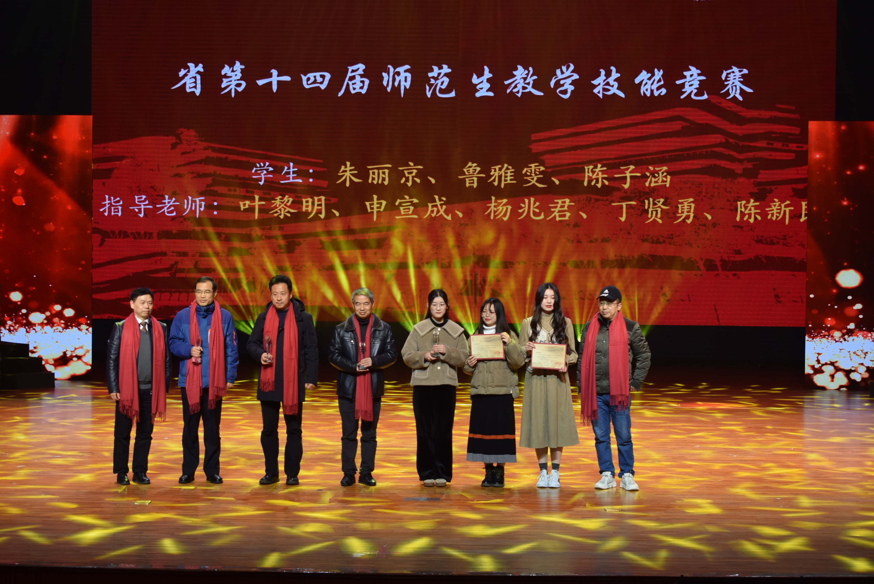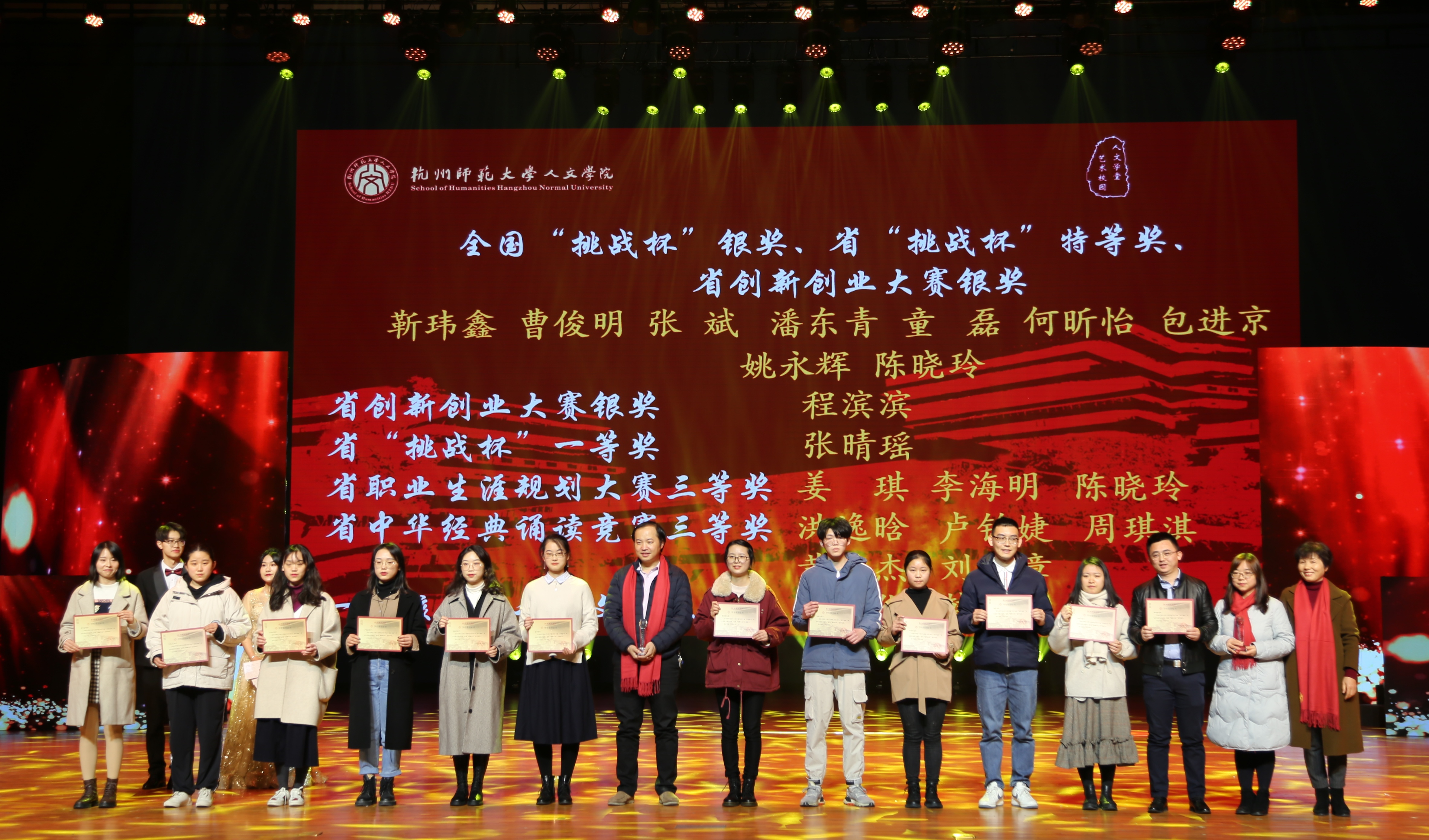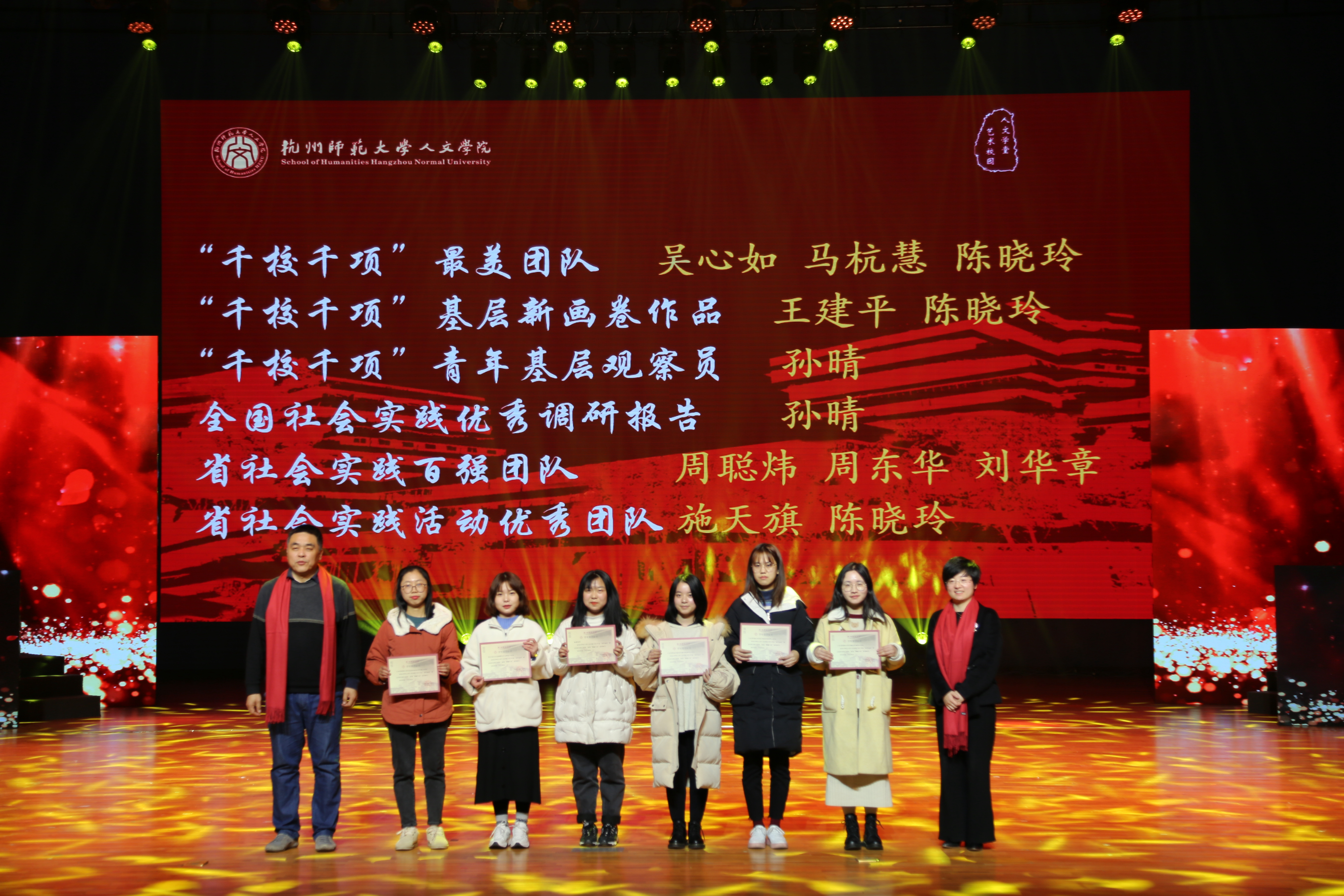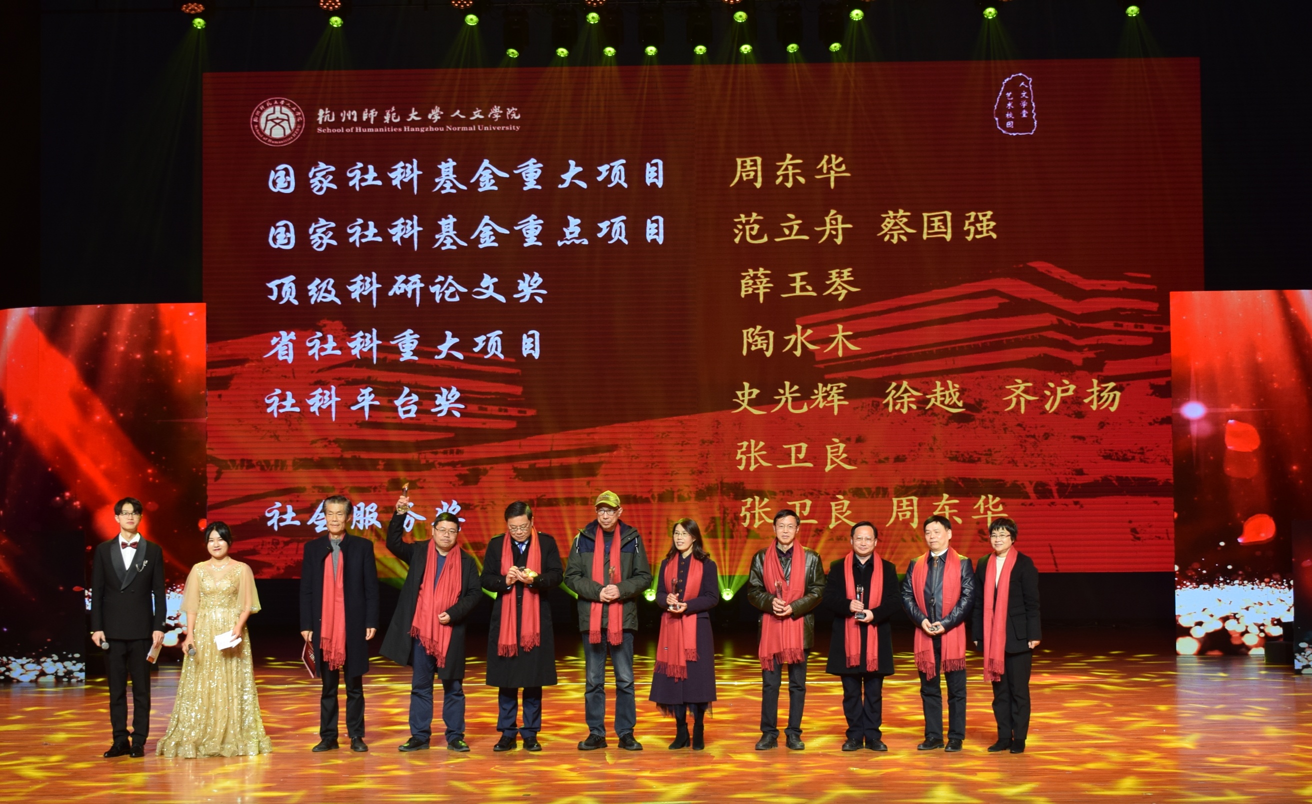 在聚力人文篇,获得浙江省产学合作协同育人项目立项的徐杨,获得第二届长三角师范院校教师智慧教学大赛三等奖的詹玲,获得杭州市优秀教师的斯炎伟,获得杭州市2020年度教师教育科研课题立项的姚永辉,获得杭州师范大学第六届“教学卓越奖”、校第一届学生最喜爱的老师的黄岳杰,获得校第五届最美师大人“十佳班主任”的林航,获杭州师范大学“最受学生欢迎课程” 的刘俊峰等老师在教学和科研路上革故鼎新,喜获教学教育类荣誉表彰。同时,小黄书 同学鲁雅雯、朱丽京、陈子涵在第十四届师范生教学技能竞赛表现突出,荣获佳绩。齐沪扬教授宣读颁奖词并和院长洪治纲教授、竺建新博士、张卫良教授等分别为获奖老师颁奖。