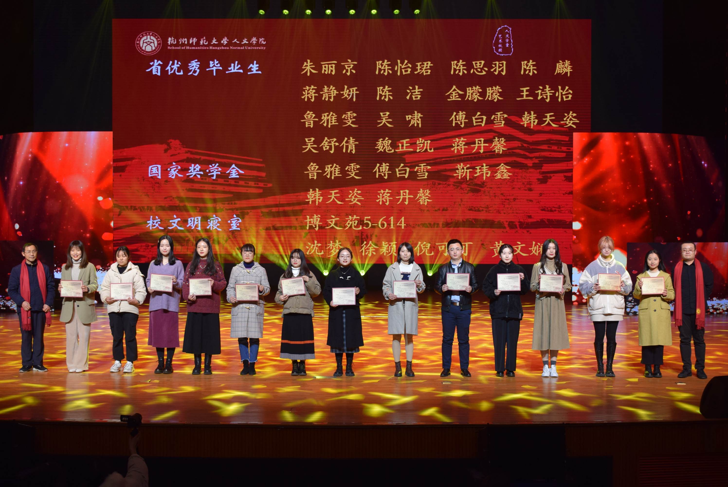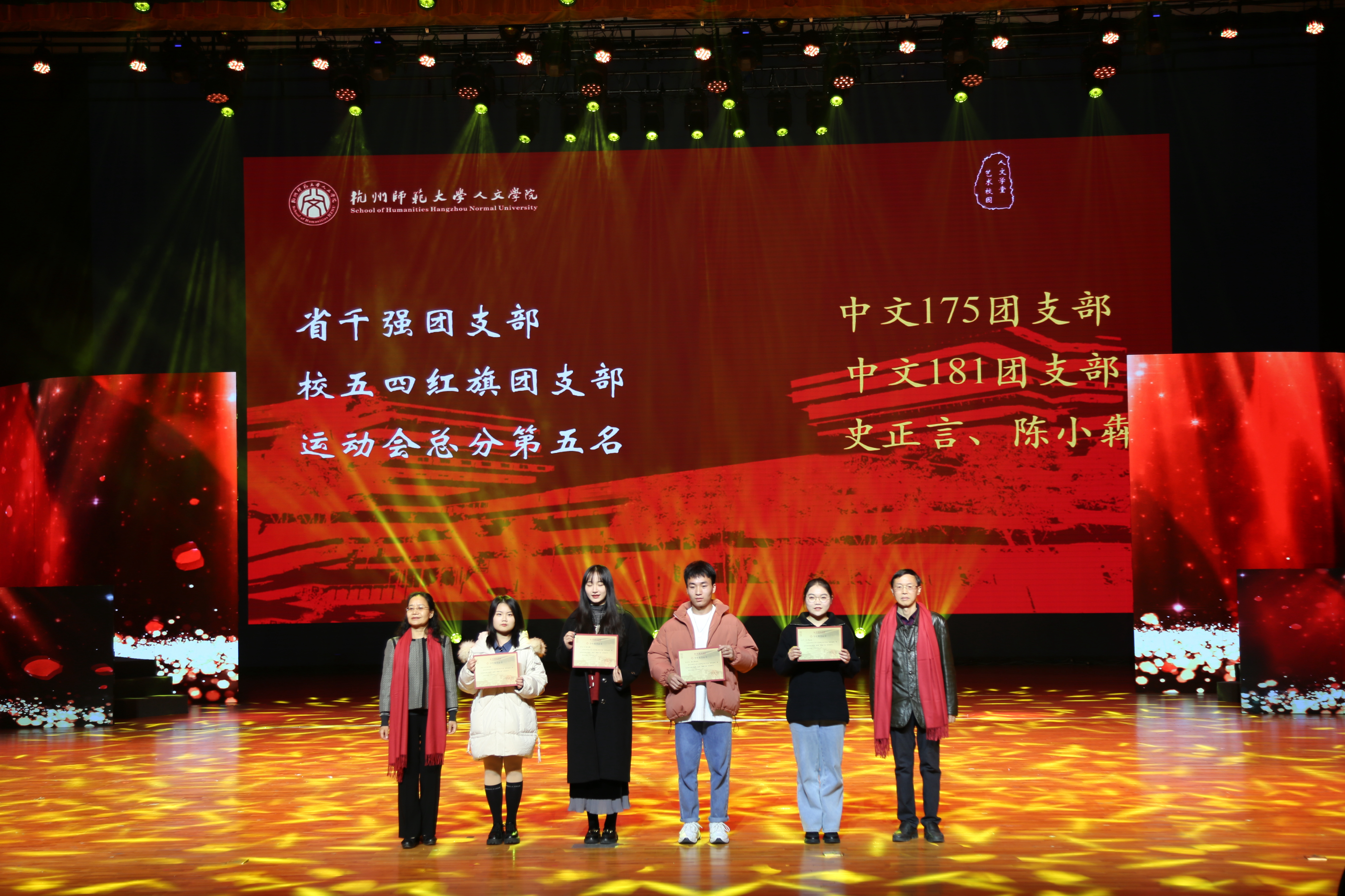 在团结人文篇,省千强团支部中文175团支部团支书闻雯、校五四红旗支部中文181团支部团支书肖依晨,校第41届运动会总分第五名代表史正言、陈小犇,校文明寝室博文苑5-614,省级优秀毕业生朱丽京、韩天姿等15人,国家奖学金获得者鲁雅雯、靳玮鑫等5人,以及五个优秀社会实践团队和一位优秀个人孙晴获得了综合类荣誉表彰。陶水木教授宣读颁奖词并和副校长黄爱华教授、陆忠发教授、刘杨博士、诸英书记、郭洪雷教授等分别为获奖师生颁奖。