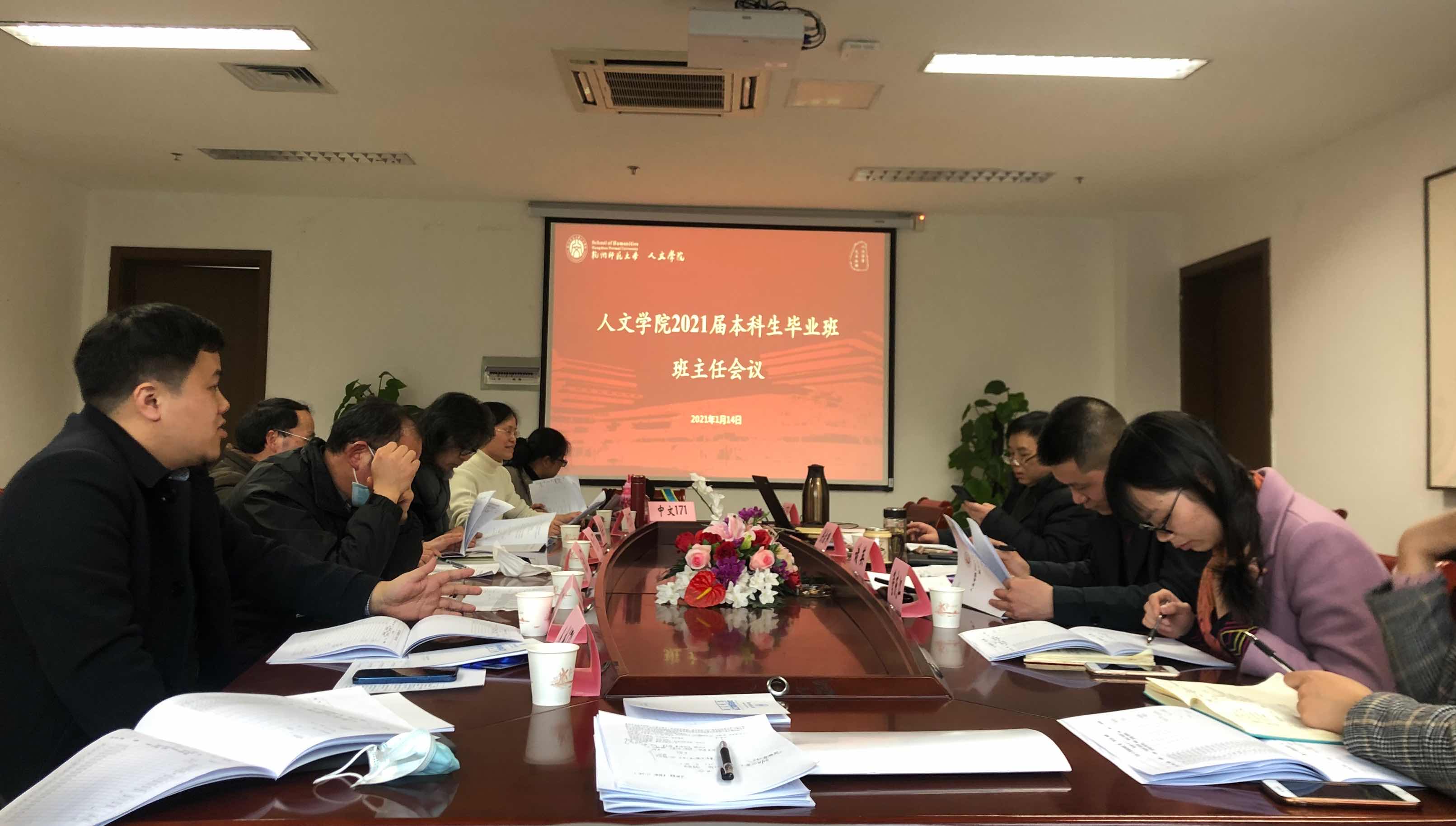 1月14日下午,小黄书 在恕园23号楼312室召开2021届本科生毕业班班主任会议,重点围绕就业工作进行研讨。学院院长洪治纲、党委书记诸英,党委副书记管庆江,2020届优秀班主任代表黄岳杰,全体2021届本科生毕业班班主任和全体辅导员参加会议。会议由管庆江主持。