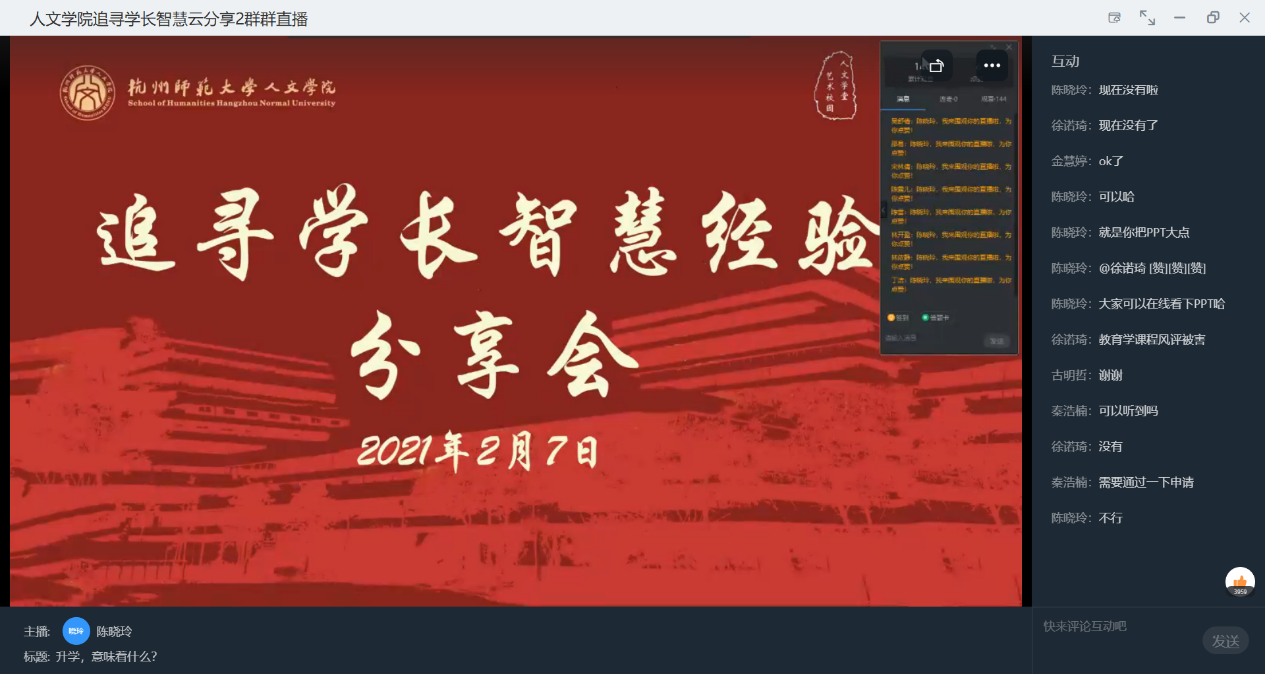 2021年2月7日14:00,小黄书 于钉钉平台顺利举办追寻学长智慧之经验分享会系列讲座——“升学,意味着什么?”。讲座由由小黄书 学工办主任陈晓玲主持。本次讲座共有270人参加,点赞数高达3960次。