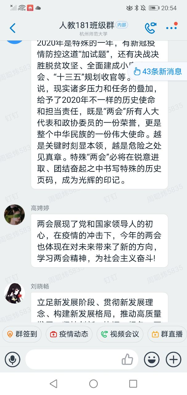 在探讨过程中,各班宣传到位,主题鲜明,各具特色。预科201班在班主任于海波的带领下共同探讨两会内容,学习两会精神,了解国内形势,明辨是非,正确理解党中央和国家所做出的科学决策;中文201班采取分组讨论的形式互相交流观看两会后的个人感悟,体悟社会主义制度下我国的改革现状与光明前景;历史202班组织全体成员集中观看两会开幕会视频,对我国于疫情经济颓势下仍取得脱贫攻坚全面胜利深有感触,反响热烈;中文204班聚焦两会提出的六大主要目标,并探讨其对当代大学生的指导意义;历史191班由“聚焦两会热点”小视频切入,展示2021两会的七大亮点,而后由同学分享“教育公平”“教师待遇”“高考改革”“高校毕业生就业”等热点话题及其看法;中文191班由班委带头,就“2021年中国发展六大走向”“两会九大关键词”等关键词与同学共同探讨,提升同学思想觉悟和政治素养;中文192班同学积极发言,就民生、就业、乡村振兴、疫情一线人员等话题各抒己见;历史181班以建党100周年为背景,回望历史,正视当下,重点关注党史学习教育,结合自身专业,树立“学史明理、学史增信、学史崇德、学史力行”的目标;人教181班就两会、“大学生诈骗情况”和“疫情防控”展开讨论,在钉钉群中写下独属自已的一份体悟;中文182班着重选择两会有关未来教育的重要提案,师生共论。