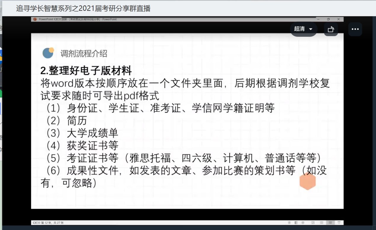 杜诚艳首先对复试及调剂流程做了清晰的介绍,分享了她关于面试的经验,强调报名调剂后,要时刻关注研招网信息以及确保研招网绑定的手机号能顺利接收信息。在一些自我介绍、自荐信、简历等准备事项上,她也给出了具体、实用的建议。