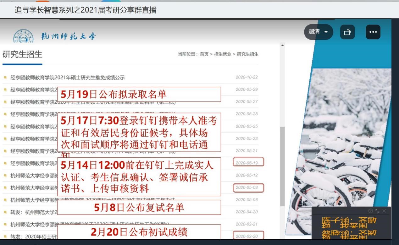 3月13日晚18:30,小黄书 于钉钉直播平台举办了“追寻学长智慧”之2021届考研经验分享会。分享会邀请到了小黄书 2020届校友杜诚艳、齐敏艳、张迎作为主讲嘉宾,为2021届考研本科毕业生带来了关于考研复试、调剂等相关知识和经验。分享会受到了全体考研的同学关注,也吸引了不少大三学生的参与。分享会由辅导员孔祥亮主持。