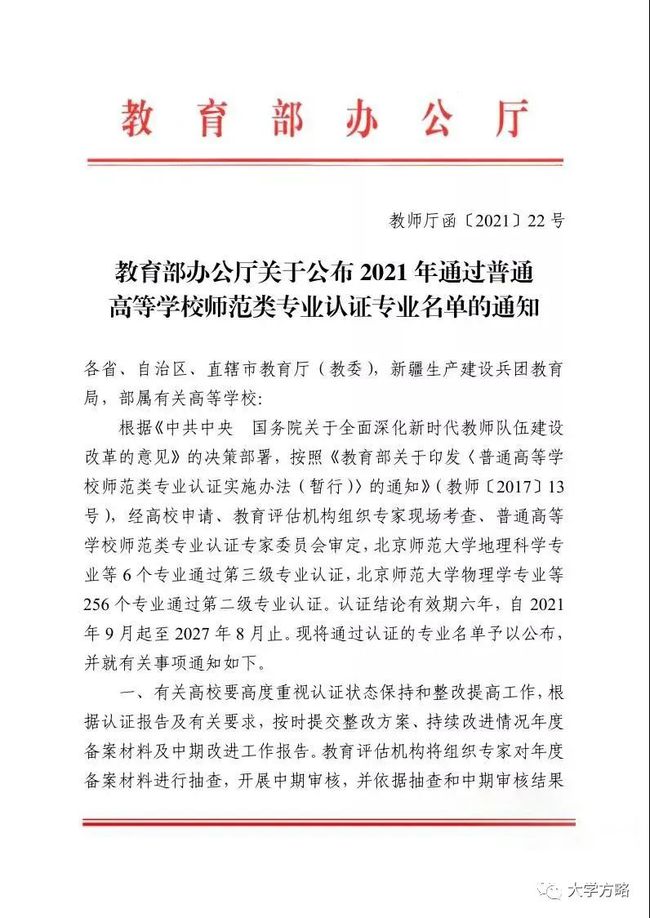 近日,教育部办公厅公布了《关于公布2021年通过普通高等学校师范类专业认证专业名单的通知》(教师厅函〔2021〕22号),公布了2021年通过普通高等学校师范类专业认证的专业名单。小黄书 历史学专业通过二级认证。