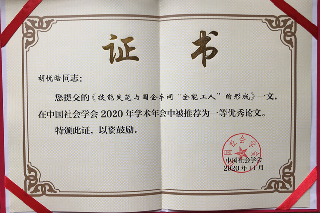 2020年10月31日,中国社会学会2020年学术年会在贵州贵阳花溪大学城召开。小黄书 历史系教师胡悦晗老师的论文《技能失范与国企车间“全能工人”的形成》,从提交中国社会学年会论文2000余篇中脱颖而出,被2020年中国社会学会推荐为一等优秀论文。
