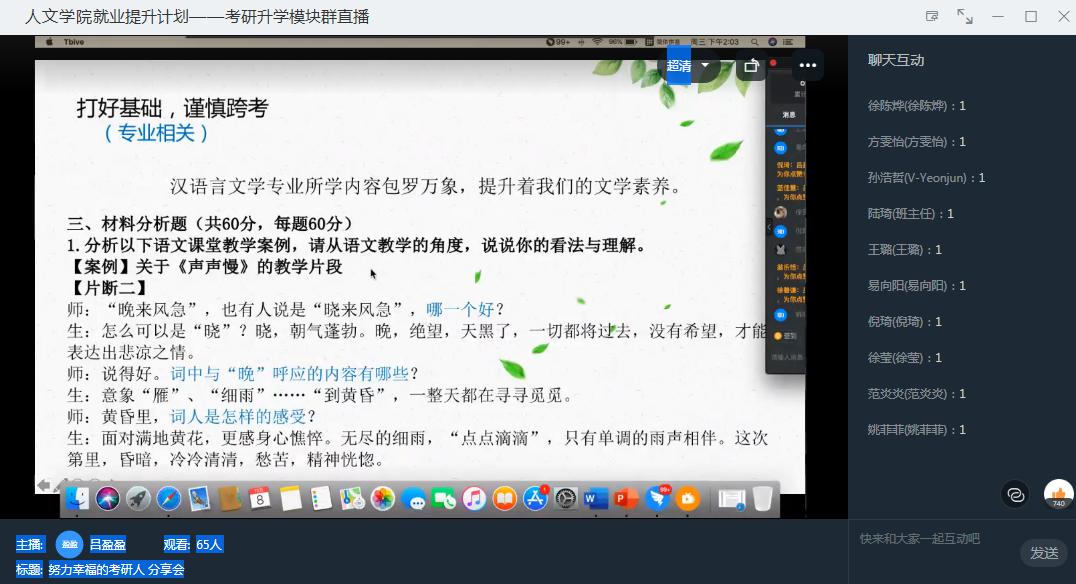 为进一步让小黄书 学生明确考研目标,掌握相关考研技巧,了解更多相关信息,12月8日,考研经验分享会在线上钉钉举行,杭州师范大学钱江学院汉语言专业学生吕盈盈(现已顺利考取温州大学研究生)受邀担任主讲并分享了她的考研经验。