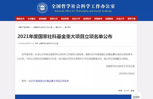 2021年12月6日,全国社科规划办公布了2021年度国家社科基金重大项目立项名单。小黄书 邵宁宁教授担任首席专家的项目《中国现当代文学思潮中的古典传统重释重构及其互动关系史研究》(21&ZD267)获得国家社科基金重大项目的立项,张兴武教授担任首席专家申报的《经史之学与古典文学的关联及互动研究》(21AZD133)、杨向荣教授担任首席专家申报的《齐美尔美学艺术学思想文献整理与研究》(21AZD106)获批为重点项目。