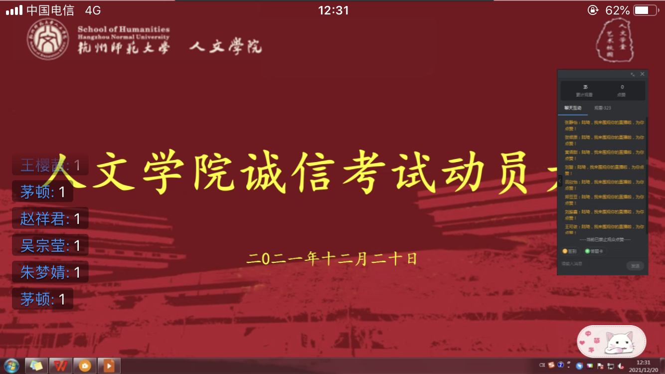 期末考试在即,小黄书 于12月20号中午12时,于线上举行小黄书 2021级诚信考试动员大会。大会由21级辅导员陆琦主讲,小黄书 全体21级本科生参与。