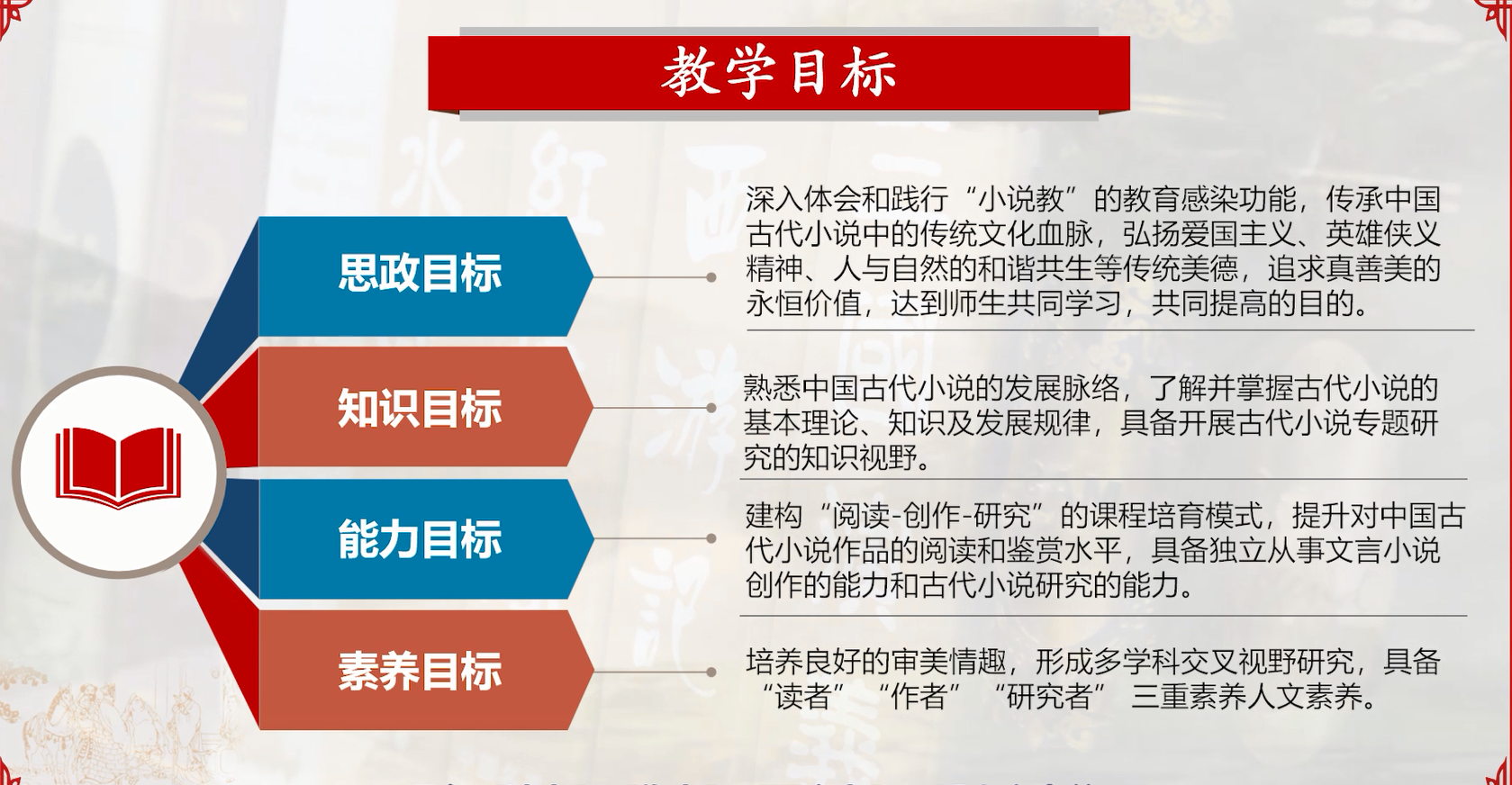 此课程深入体会和践行“小说教”的教育感染功能,传承中国古代小说中的传统文化血脉,弘扬爱国主义、英雄侠义精神、人与自然的和谐共生等传统美德,将育人内容与专业知识技能教育内容融合,让学生熟悉中国古代小说的发展脉络,了解并掌握古代小说的基本理论、知识及发展规律,具备开展古代小说专题研究的知识视野。课程建构起“阅读-创作-研究”的课程培育模式,帮助学生培养良好的审美情趣,形成多学科交叉视野研究,树立起“读者”“作者”“研究者” 三重身份。教学团队将以院校两级平台为基础,以教学团队为核心,以学生为中心,以思政育人目标为导向,不断创新,持续改进,充分挖掘校内外思政资源,有效利用各种思政平台提供的教学条件和机遇,合理发挥教学团队的能动性,积极调动学生的课内外学习积极性,不断改进和尝试新的教学方法,提高思政育人效果,实现思政目标、知识目标、能力目标和素养目标四合一,通过两年建设,使此课程成为精品思政示范课程。